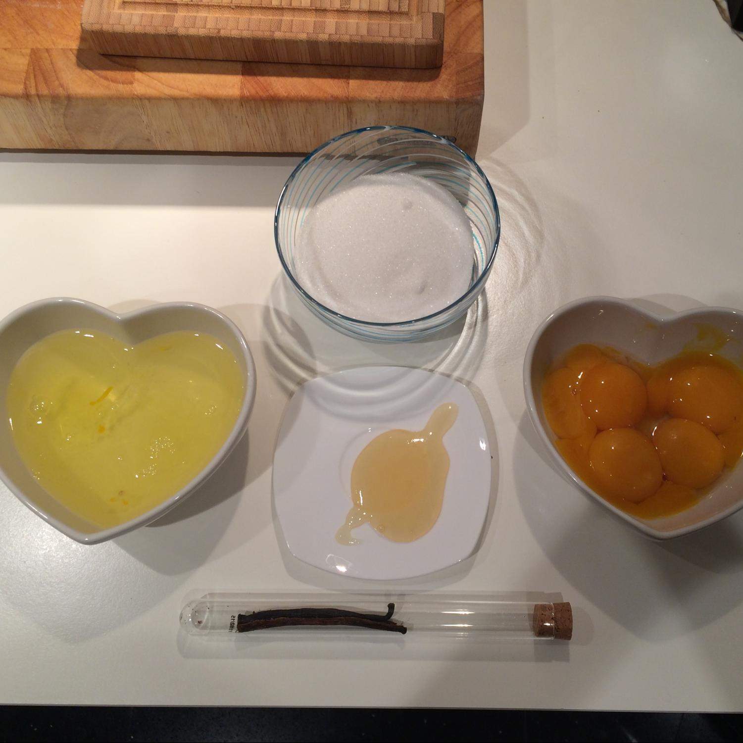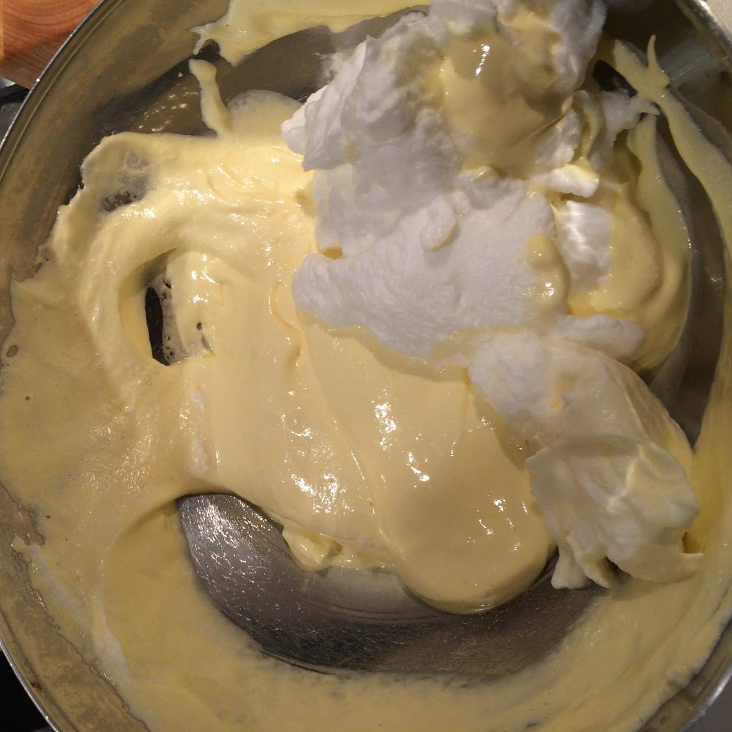 "coperchio chiuso" con la farfalla inserita versare i tuorli (5 tuorli) 90 gr. di zucchero, 10 gr. di miele e la vaniglia fino ad ottenere un impasto soffice, 8/10 min. vel. 5.In una ciotola a parte incorporare con la spatola i due impasti ottenuti mescolando dal basso verso l'alto cosi incorporando l'aria.