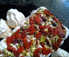 Foderare con pellicola trasparente o cartafornol'interno dello stampo, distribuire sul fondo le bacche scolate , poi i pistacchi, Con un sac à poche a bocca larga depositare un primo strato di panna, con le mani sbriciolare le meringhe , distribuire un secondo strato di panna, stendere ora i cornflakes e finire con la panna rimasta.