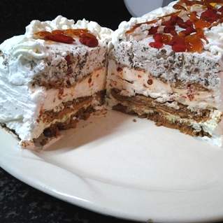 sovrapporre una meringa, proseguire con panna goji, 2° meringa, poi panna Pomelo e finire con la 3° meringa. mettere al freezer alcune ore. Capovolgere in un piatto di portata e decorare a piacere. In questo caso con la panna accantonata, con residui di goji, di Pomelo e gocce di caramello solidificato ricavato portando a fusione un po’ di zucchero sul fornello in un recipiente .