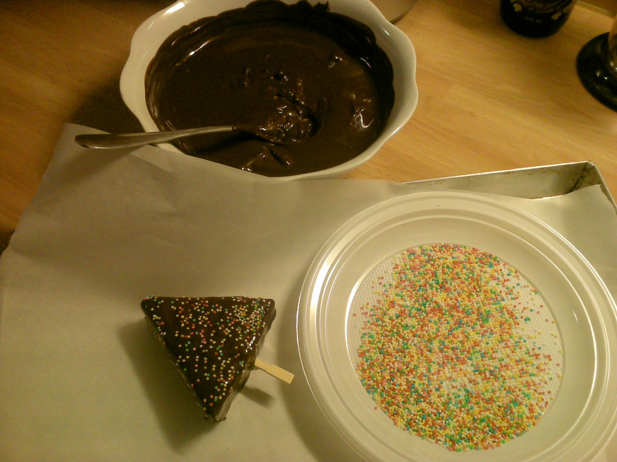 Trita le nocciole 30 sec. vel. 9 e metti da parte. Lava il boccale metti la farfalla e monta gli albumi con un pizzico di sale 4 min. vel. 4 e metti da parte. Togli la farfalla e senza lavare il boccale metti i tuorli e 4 cucchiai di acqua bollente, zucchero, vanillina e lavorare 1 min. vel.5, aggiungi farina,fecola, cacao,nocciole, burro fuso, ed infine il lievito, lavorare 1 min. vel.5. Togli l'impasto dal boccale, versa in una ciotola e incorpora delicatamente gli albumi montati a neve dal basso verso l'alto, versa in una tortiera rettangolare (20x30) foderata con carta da forno. Metti in forno preriscaldato a 175° per 30 min. Fai raffreddare bene la torta, togli dalla carta e dividila in tanti triangoli. Con una siringa da puntura (togliendo l'ago ovviamente) riempi di nutella tutti i lati del triangolo (per ogni triangolo una siringa piena di nutella) e poi infila la forchettina di legno nella base di ogni triangolo, intingili nel cioccolato fuso, elimina l'eccesso e appoggiarli su carta da forno. In seguito passali nei confettini, appoggiali sulla carta da forno e metti in frigo per 30 minuti. Staccali dalla carta da forno e servi