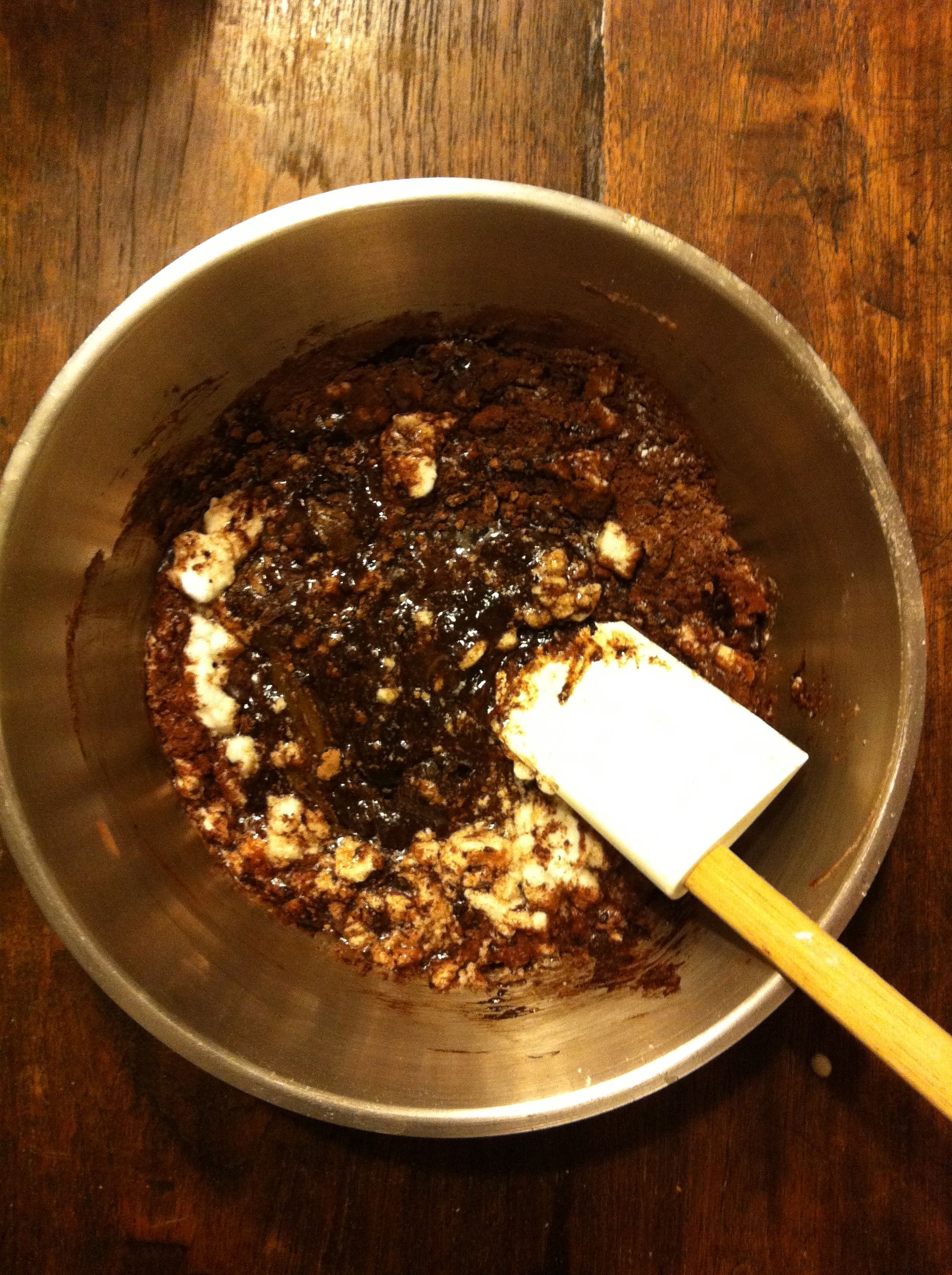 Aggiungere gli albumi montati al composto di cacao e mescolare delicatamente dall'alto verso il basso finchè il composto non risulterà omogeneo. Aggiungere poco per volta i biscotti sbriciolati e mescolare fino ad ottenere un impasto compatto che si stacca dalla ciotola.