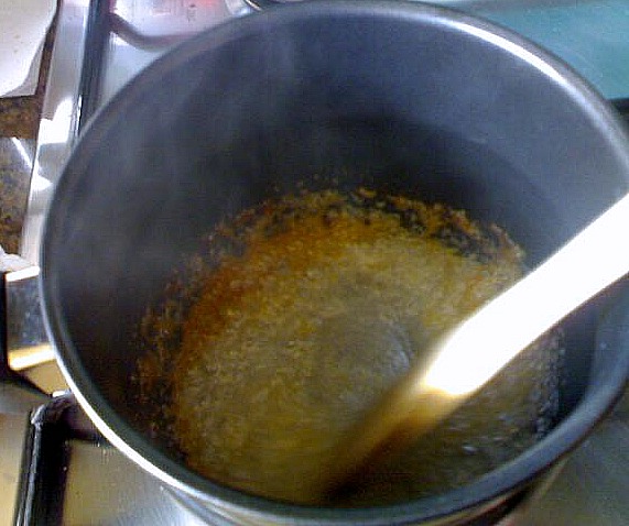Nel frattempo mettere sul fuoco in un padellino antiaderente  lo zucchero con 2 cucchiai di acqua e caramellare: quando il caramello è pronto aggiungerlo all'impasto in cottura.dal foro del boccale, senza fermare il coperchio chiuso"coperchio chiuso" ,