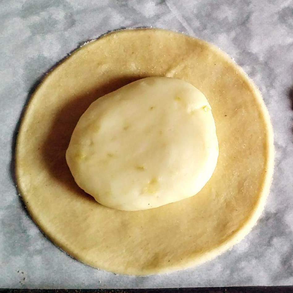 "velocità spiga" . Con il mattarello o con la macchina per la pasta, formare dei dischetti di circa 8 cm di diametro; più sottili sono, meglio é. Disporre un disco di pasta su un vassoio, mettere al centro un dischetto di formaggio e ricoprire con un secondo disco di pasta.