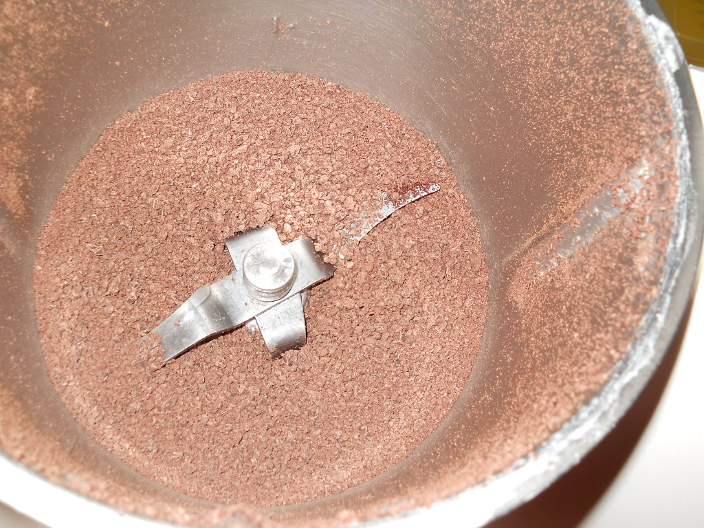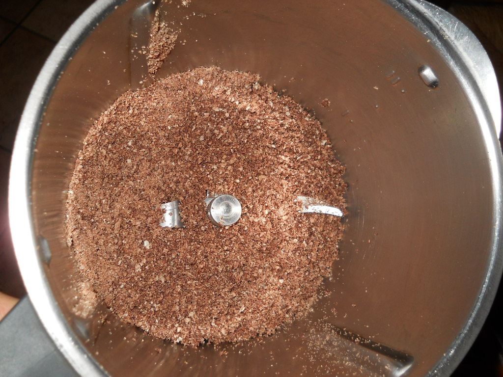 1. Inserite nel coperchio chiuso"coperchio chiuso" i wafer al cioccolato fondente e tritare con qualche colpo turbo non troppo fini, ma nemmeno troppo grossi e metterli da parte.