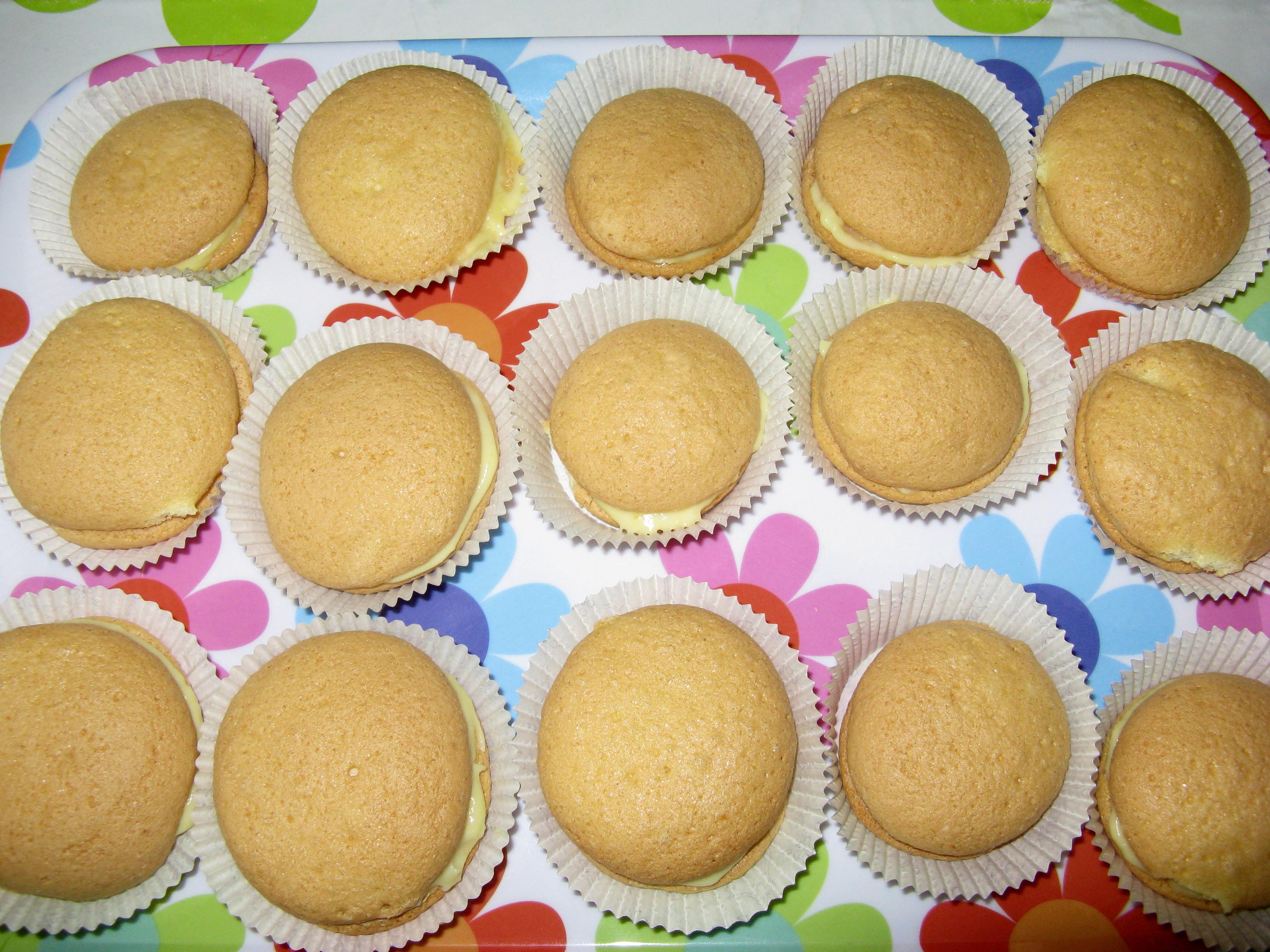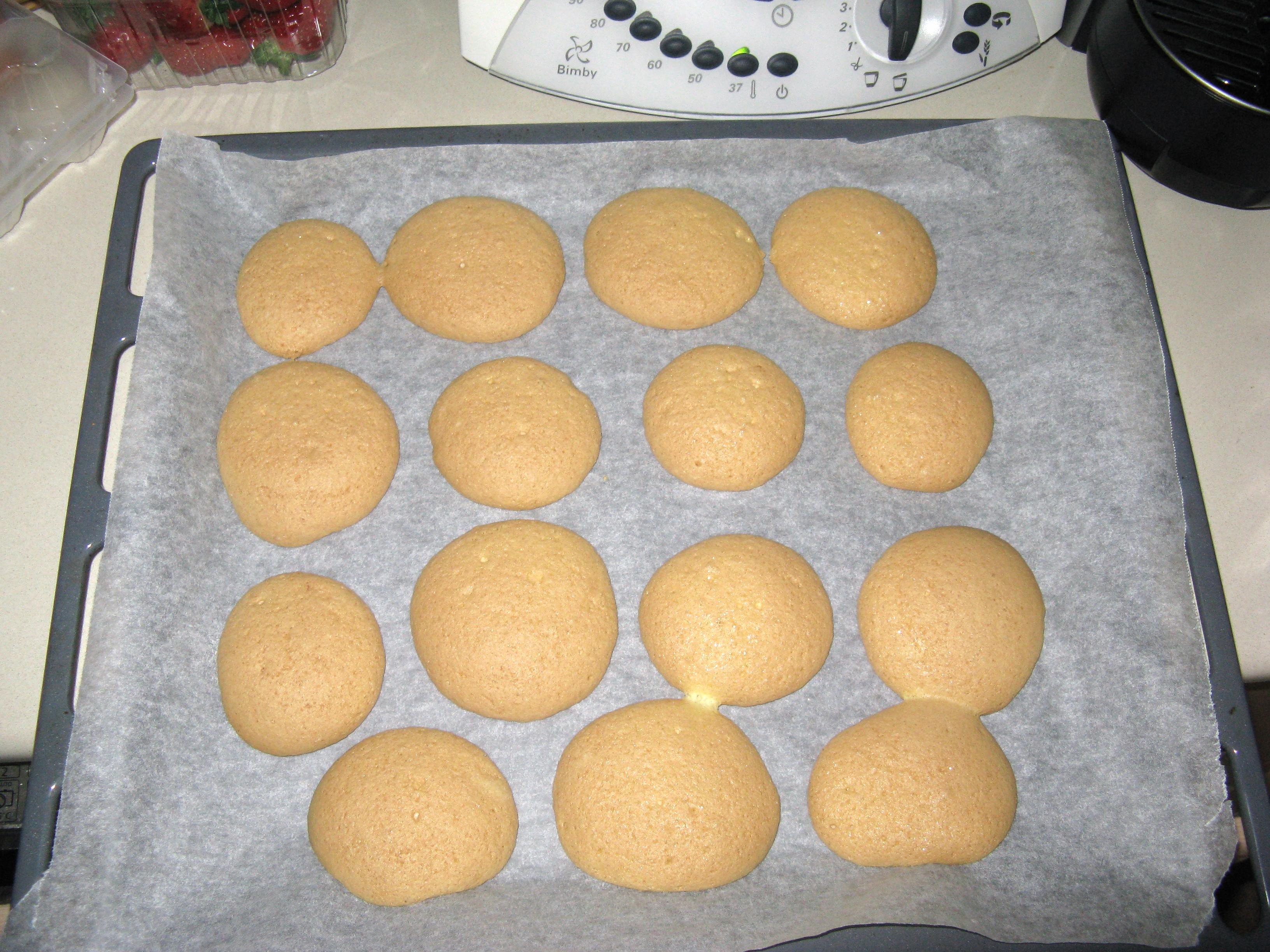 Mettere la carta forno in due teglie. Con un cucchiaio formare 30 dischetti di Pan di Spagna, distanziandoli tra loro perché nel forno gonfiano.