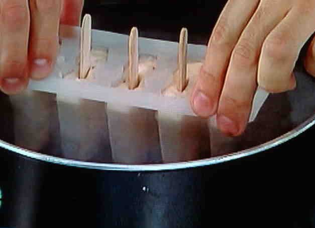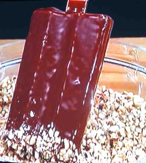 "coperchio chiuso" inserire a pezzettoni il cioccolato al cacao e il cioccolato bianco tritare a vel 4 per 1 minuto e poi a vel 1 cuocere a 80° per 10 minuti . (questo cioccolato sciolto serve per fare la buccia di cioccolato allo stecco quella che vi rimane mettetela in frigo da utilizzare per un'altra volta.il cioccolato bianco è importante perchè contiene tanto burro di cacao che impedisce alla buccia di copertura di essere troppo spessa.) Togliere dal frigo la crema chantilly e unirle amarene a pezzettoni grossi. consiglio il coltello in questo caso per non tritare troppo le amarene che devono essere molto grosse tagliate in 3 pezzi unirle alla chantilly aiutandovi con una spatola.con un sacchetto da pasticcere usa e getta inserire la chantilly con le amarene negli stampini da gelato e inserire lo stecco che rimarrà molto bene in piedi perchèla chantilly è densa, la bocca del sacchetto da pasticcere deve essere grande per far passare la amarene a pezzettoni. sbattere le formine al ripiano per far attaccare bene la crema senza bolle di aria METTERE IN FREEZER almeno x per 2 ore.per far uscire lo stecco gelato immergere le formine dentro una pentola di acqua calda per pochissimo tempo e far uscire lo stecco congelato. A questo punto immergere gli stecchi gelato nel cioccolato caldo che avrete messo in un contenitore stretto e alto per poter immergere gli stecchi. Lo stecco congelato fa sì che il ciocolato tiepido si attacchi bene bene al gelato e va a formare la copertura che non deve essere spessissima per poi mangiarla senza difficoltà.Prima che la glassa si sia asiugata passarli nella granella di nocciole. precedentemente tritata nel