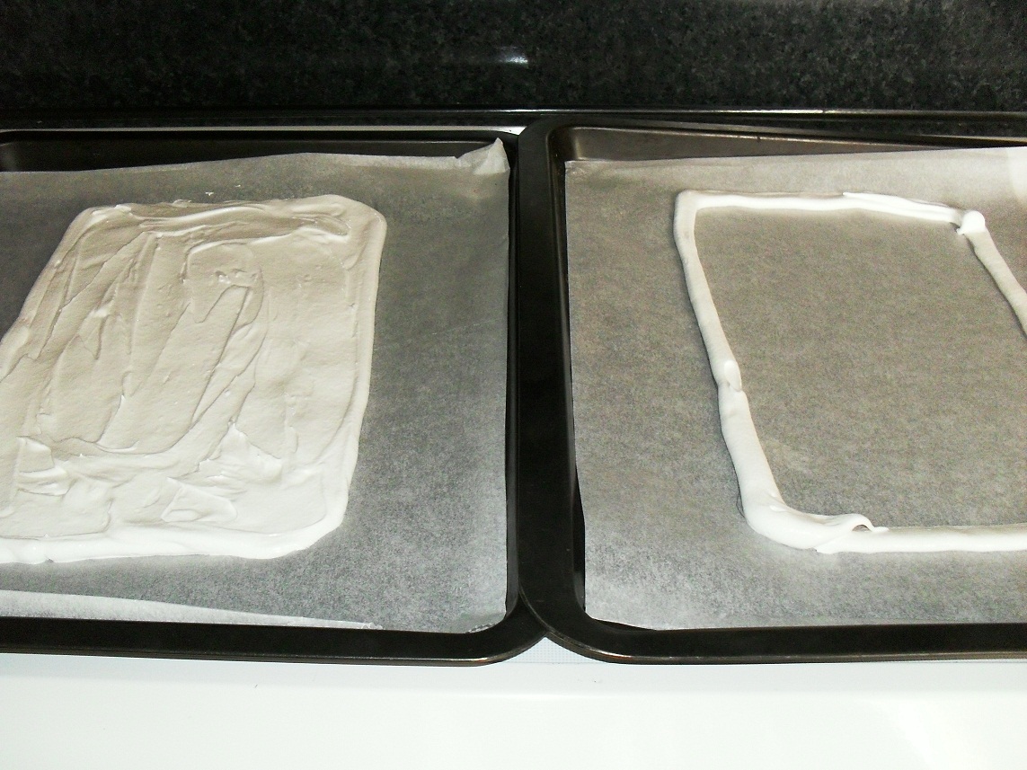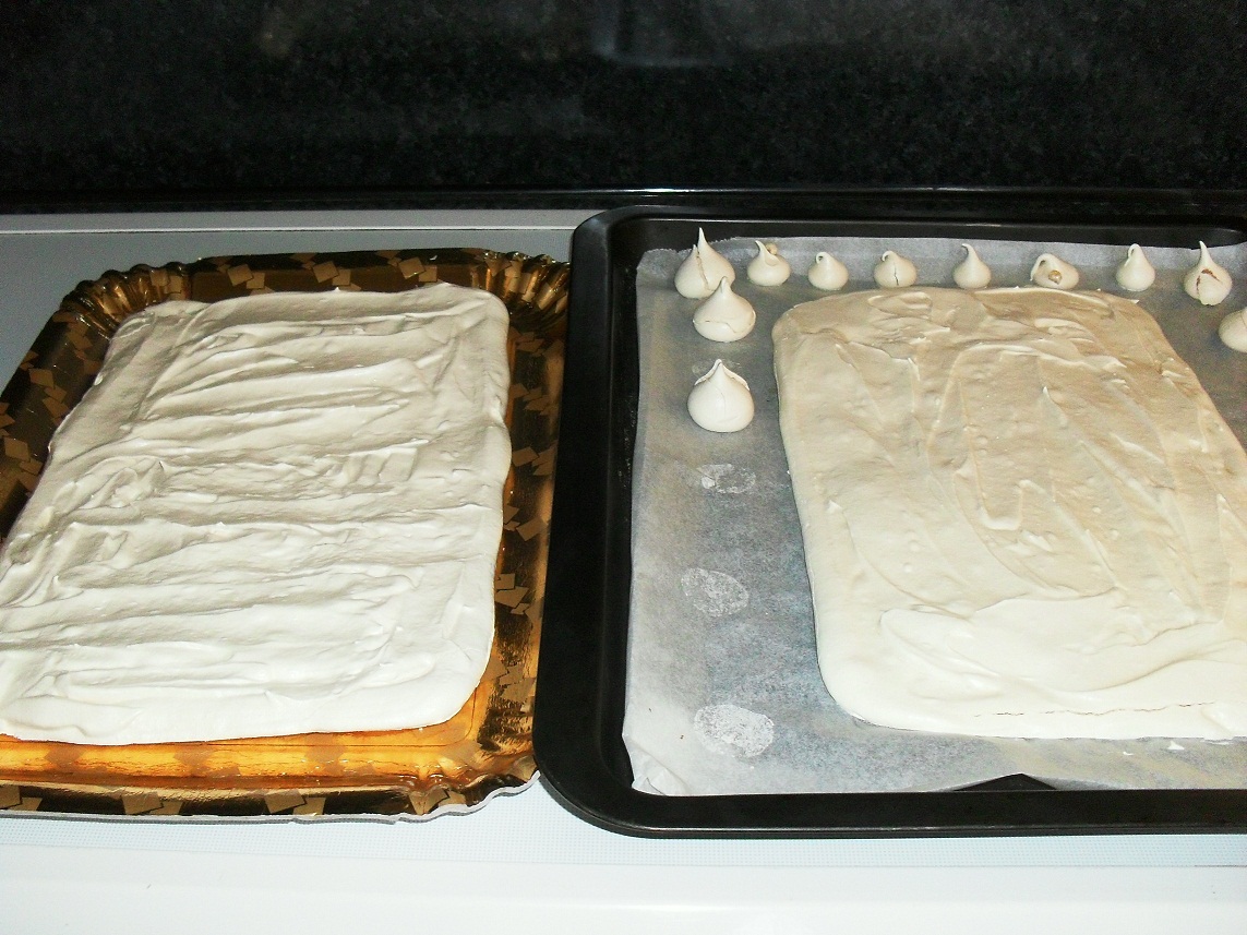 FODERARE 2 PLACCHE CON LA CARTA ,DISEGNARE UN CERCHIO CON LO STAMPO CHE SI USA PER IL SEMIFREDDO- RIEMPIRE LA SACCA CON GLI ALBUMI MONTATI E FARE PRIMA IL GIRO ESTERNO POI RIEMPIRE E LIVELLARE CON LA SPATOLA- IN FORNO A 100° PER 1 ORA-