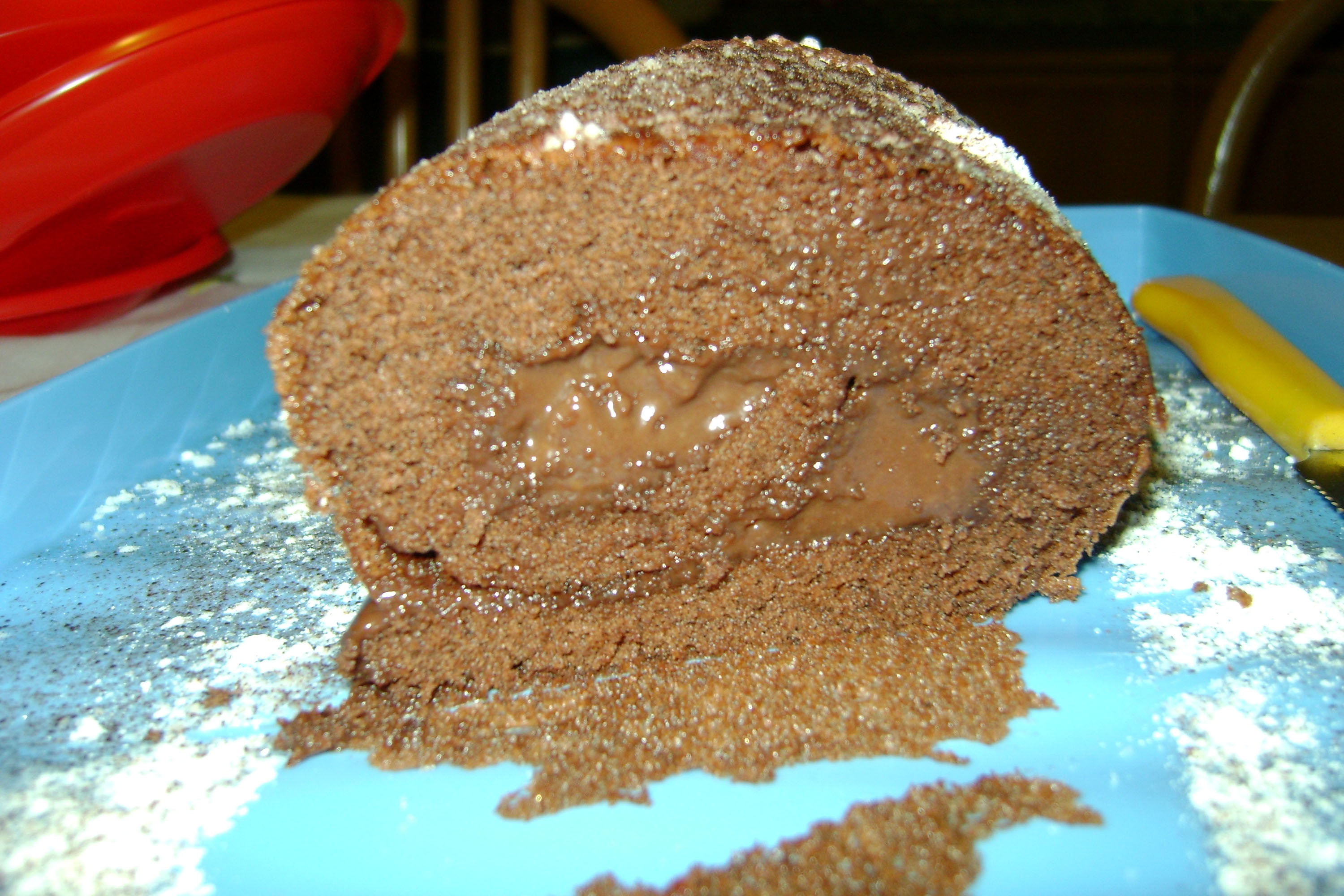 Una volta che la crema si sia intiepidita, farcire il rotolo di pan di spagna e arrotolare nuovamente. Cospargere con lo zucchero a velo e volendo anche con delle scaglie di cioccolato.