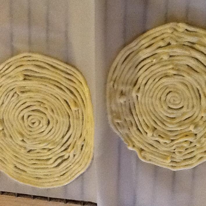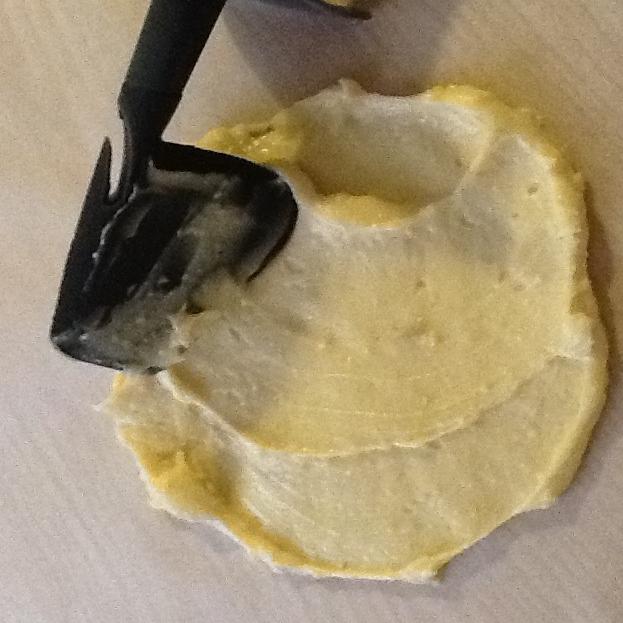 Qui mi ero stancata di girare con la sac a poche, così ho messo una bella quantità di pasta sulla carta forno e l'ho stirata con la spatola.