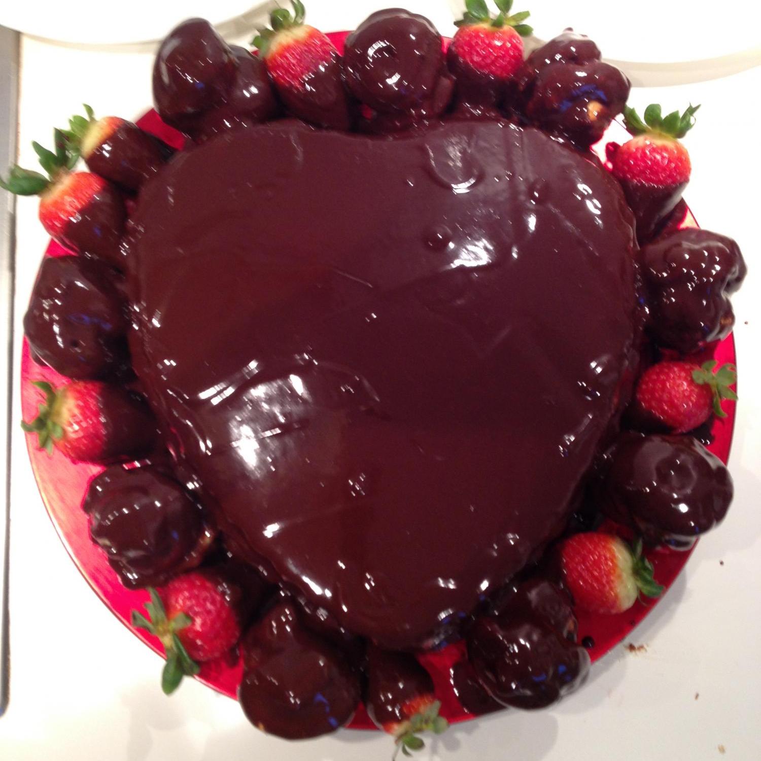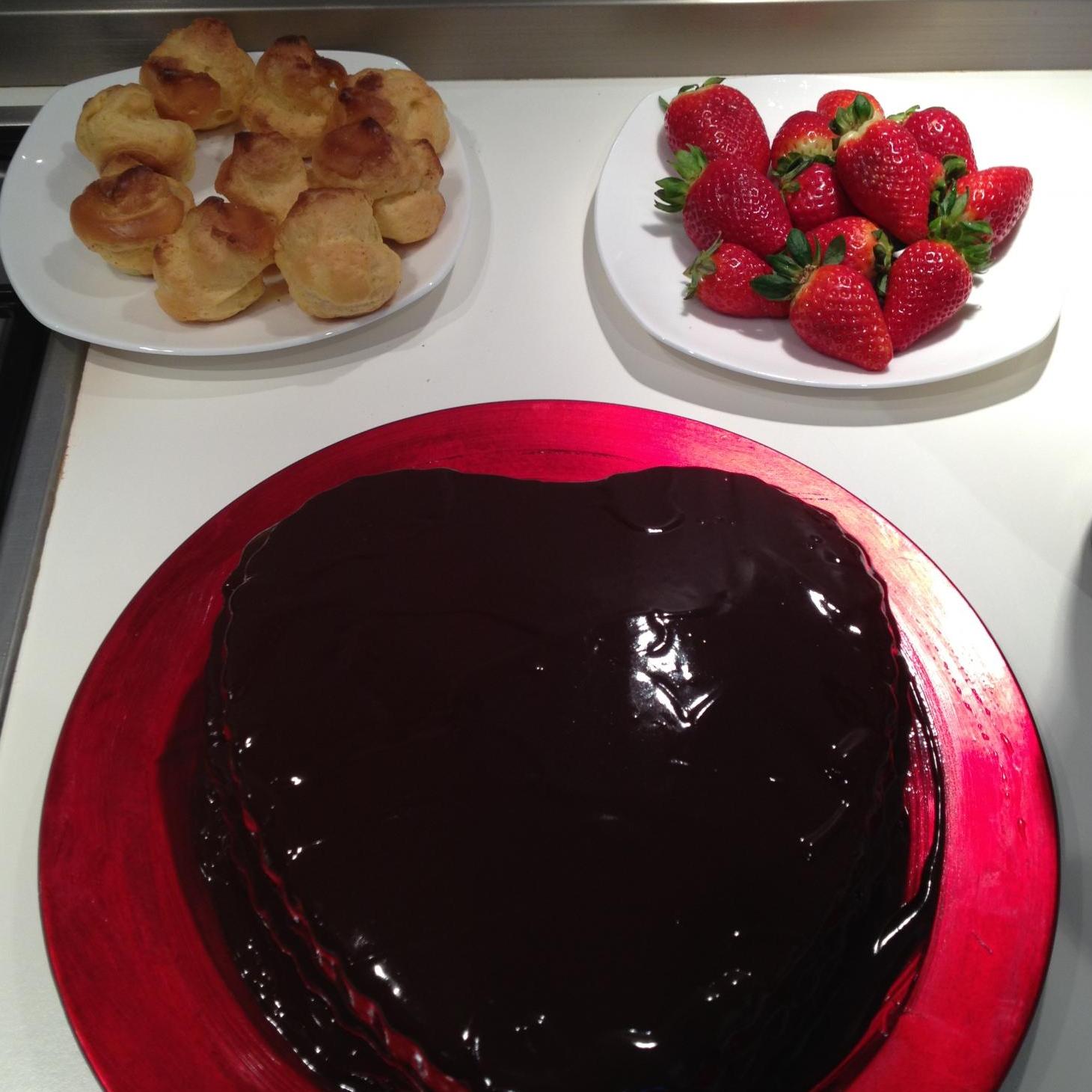 posizionare l'altro strato sempre bagnato, altro strato di crema e fragoline a pezzettini.posizionare l'ultimo strato di pan di spagna.posizionarlo su una grata e stendere il cioccolato fondente su tutta la superfice. immergere completamente i bigne precedentemente farciti con la crema, nella cioccolata e le fragole solo la punta