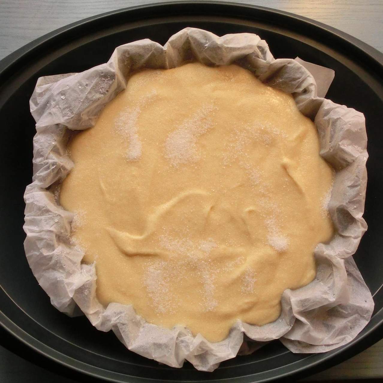 Foderare di carta forno bagnata e strizzata uno stampo che stia di misura nel recipiente del Varoma, mettere sul fondo 2 cucchiai di miele o sciroppo d’acero, versare le mele cotte precedentemente ed infine versare delicatamente l’impasto del dolce, spolverare di zucchero.