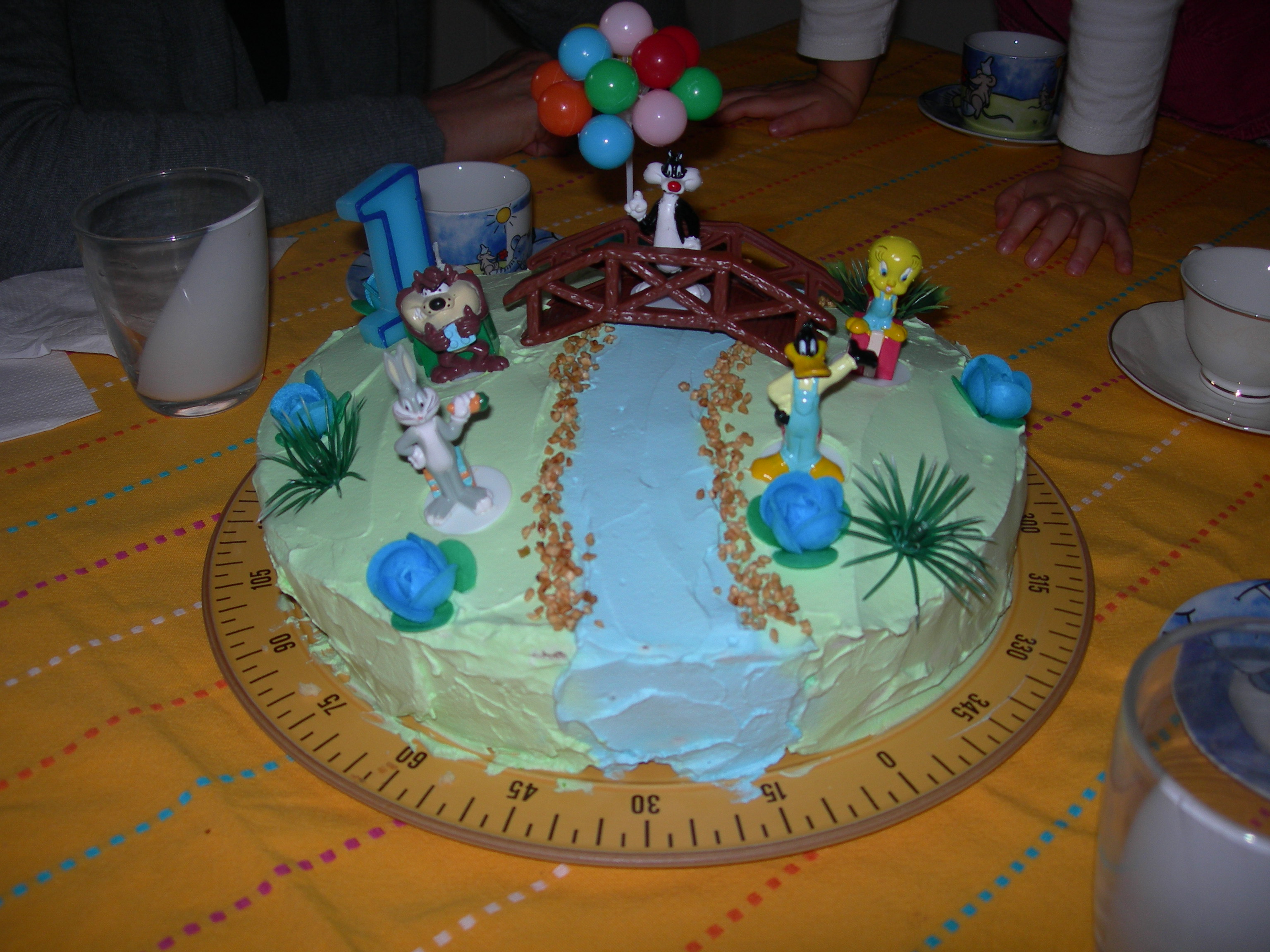 "coperchio chiuso" , poi versare la panna restante insieme al colorante azzurro e montare. versare in un'altra ciotolaComporre la torta disegnando sulla calotta del pds il tracciato del fiumiciattolo. Versare la panna verde e la panna azzurra, stenderla stando attenti a non mescolare i colori. Segnare i confini del fiumiciattolo con il riso soffiato nocciolato e collocare il set dei Looney Tunes.