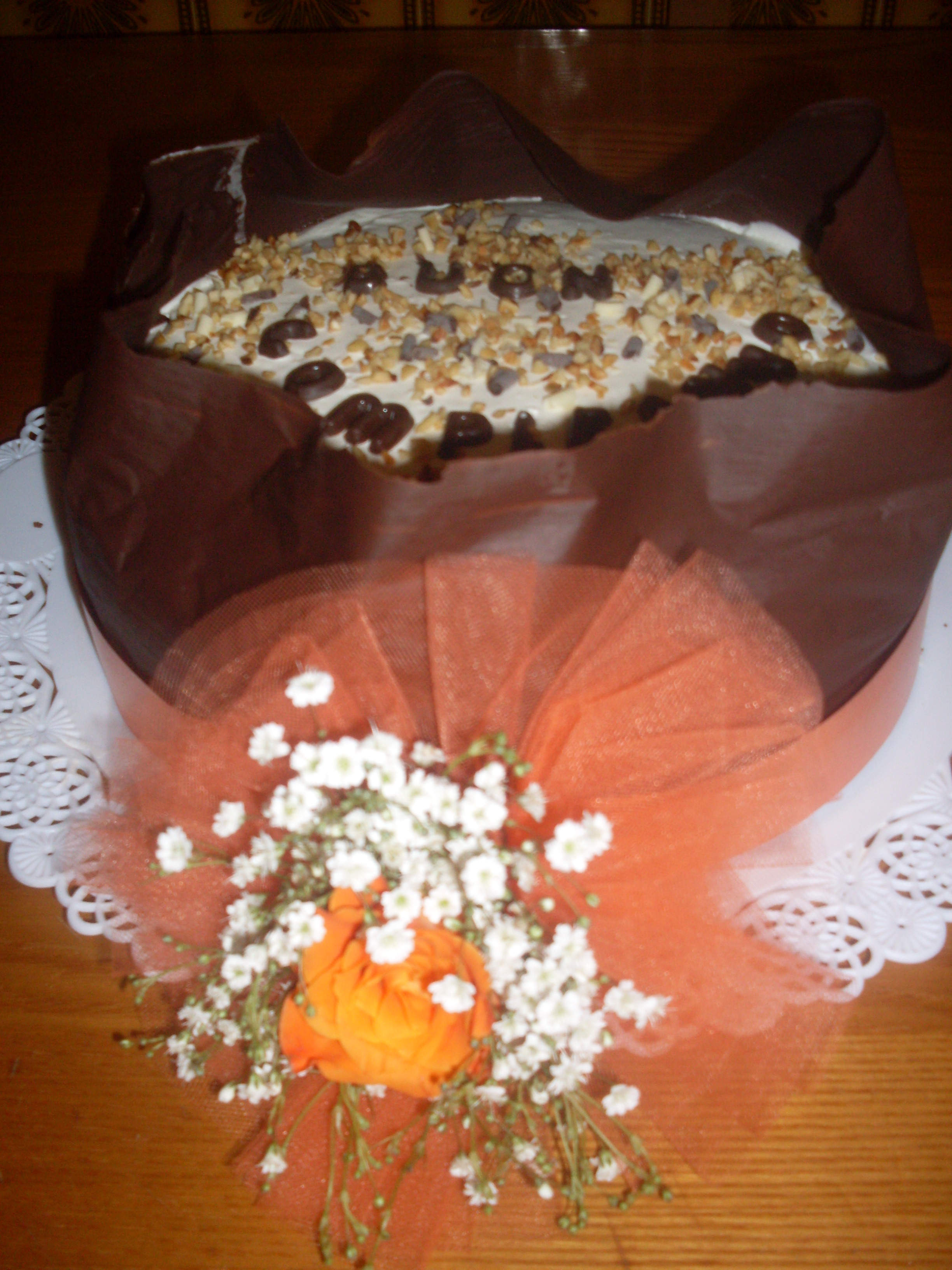 Tagliare la torta in 3 dischi, bagnare, farciarla con una parte della crema, aggiungere generosamente il topping, spolverare con granella di nocciola e gocce di cioccolato. Andare avanti fino a quando non si completa la torta.