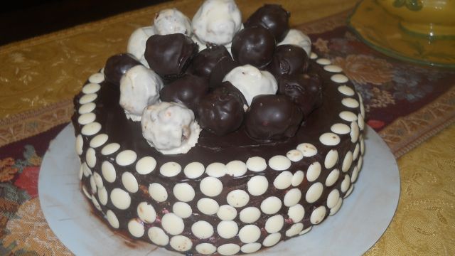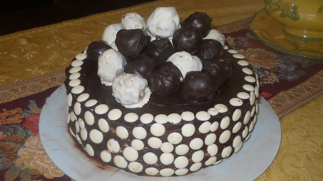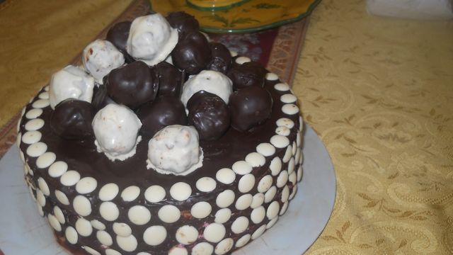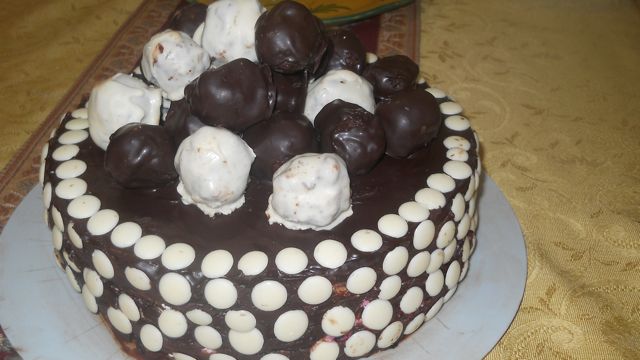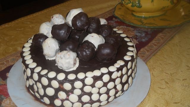 Coprire la torta, bordi compresi con la glassa al cioccolato nero avendo cura di stenderla bene (aiutarsi con un coltello a base larga). Bagnare parte dei tartufini con la glassa al cioccolata bianco e parte con quella nera. Farli raffreddare su carta forno, quindi metterli al centro della torta alternando quelli bianchi a quelli neri.