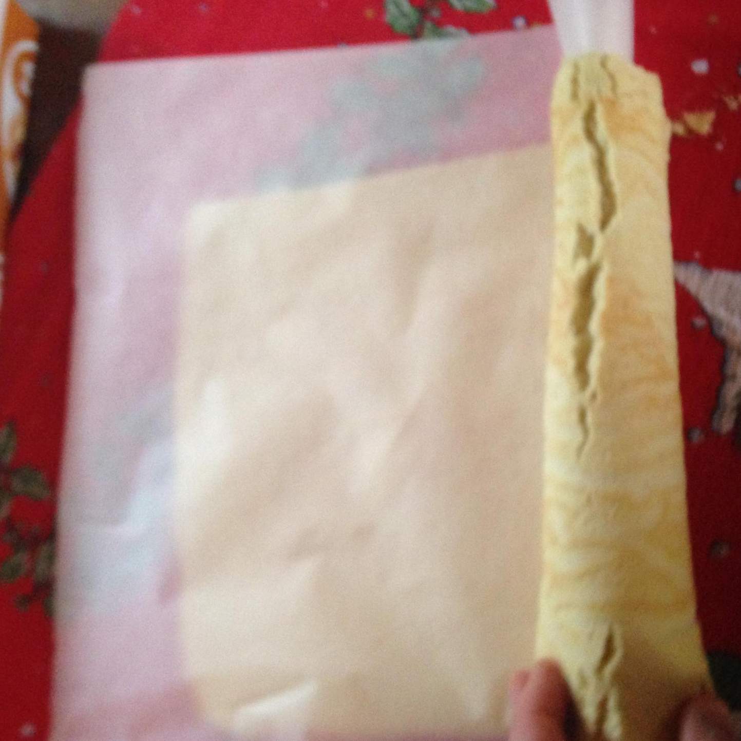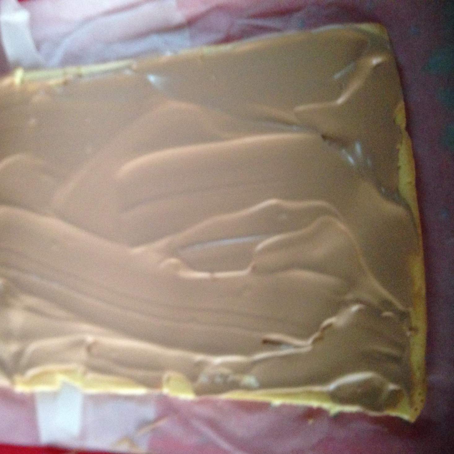 Sopra il panbiscotto steso su un piano, inzuppare leggermente con il maraschino (se i bordi del panbiscotto sono un pò croccanti tagliateli), stendere il composto e arrotolare nuovamente su se stesso (senza la carta forno)