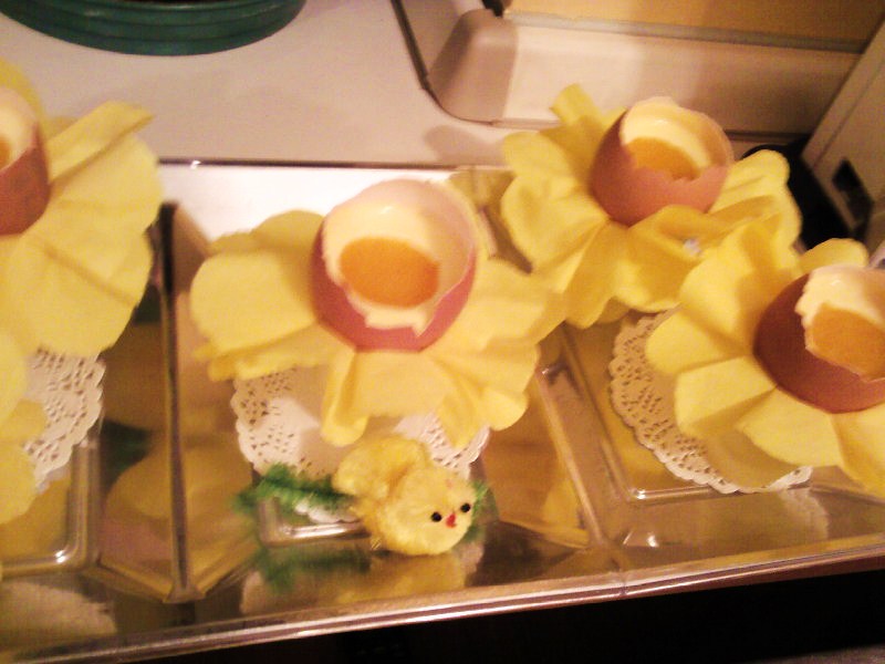 PER LA PRRESENTAZIONE. HO TAGLIATO DAI TOVAGLIOLI GIALLI UN FIORE HO MESSO ALL'INTERNO L'UOVO E L' APPOGGIATO SU UN BICCHIERINO .