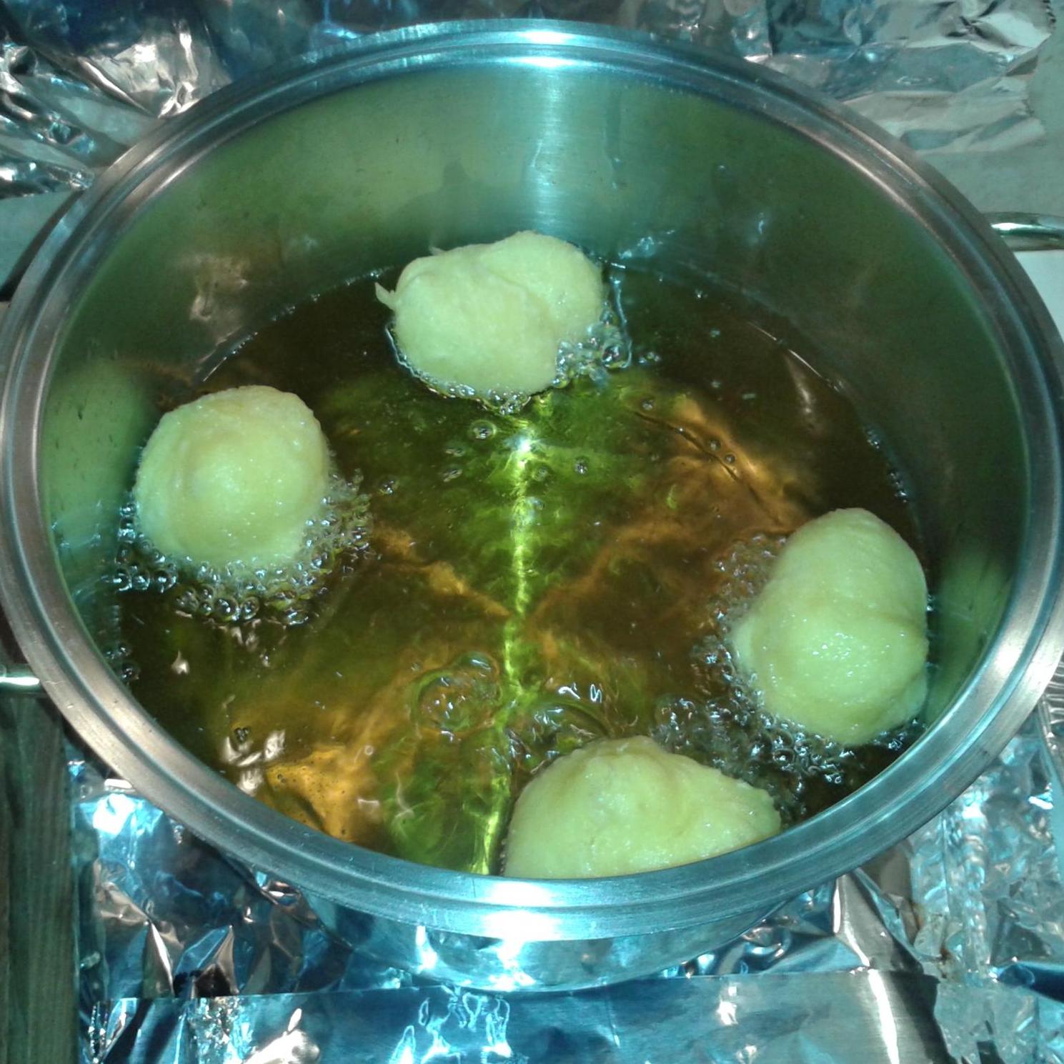 mettere a riscaldare l'olio in un contenitore alto per almeno 15 minuti a fiamma media, raggiunta la temperatura aggiungere il composto, dimensioni come una grossa noce, aiutandosi con due cucchiai, quando il composto raddoppia ed ha il colore classico della frittura posizionarlo in un contenitore con carta assorbente.