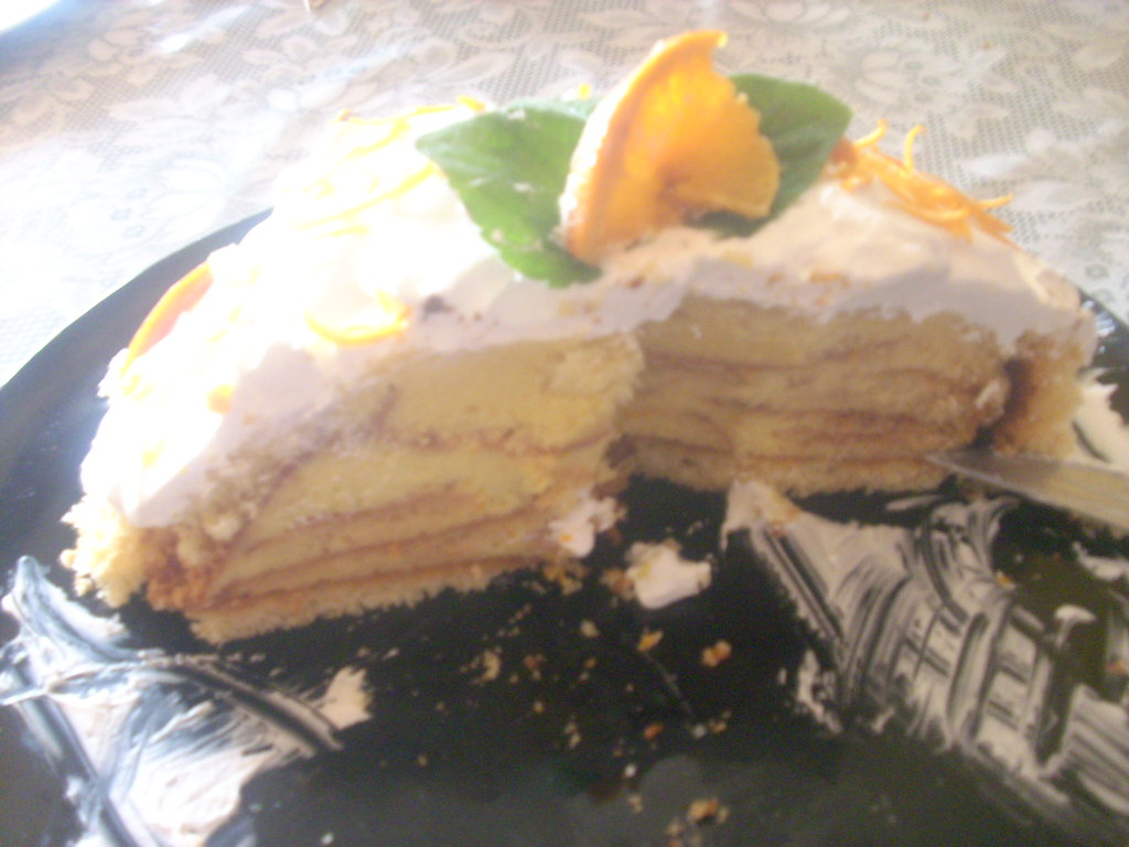 "coperchio chiuso" mettere la farfalla montare il resto della panna 2min circa vel 4 attenzione a non farla impazzire ,ricoprire il dolce con questa panna e decorare con i2 mandarini ,si possono anche caramellare con del miele