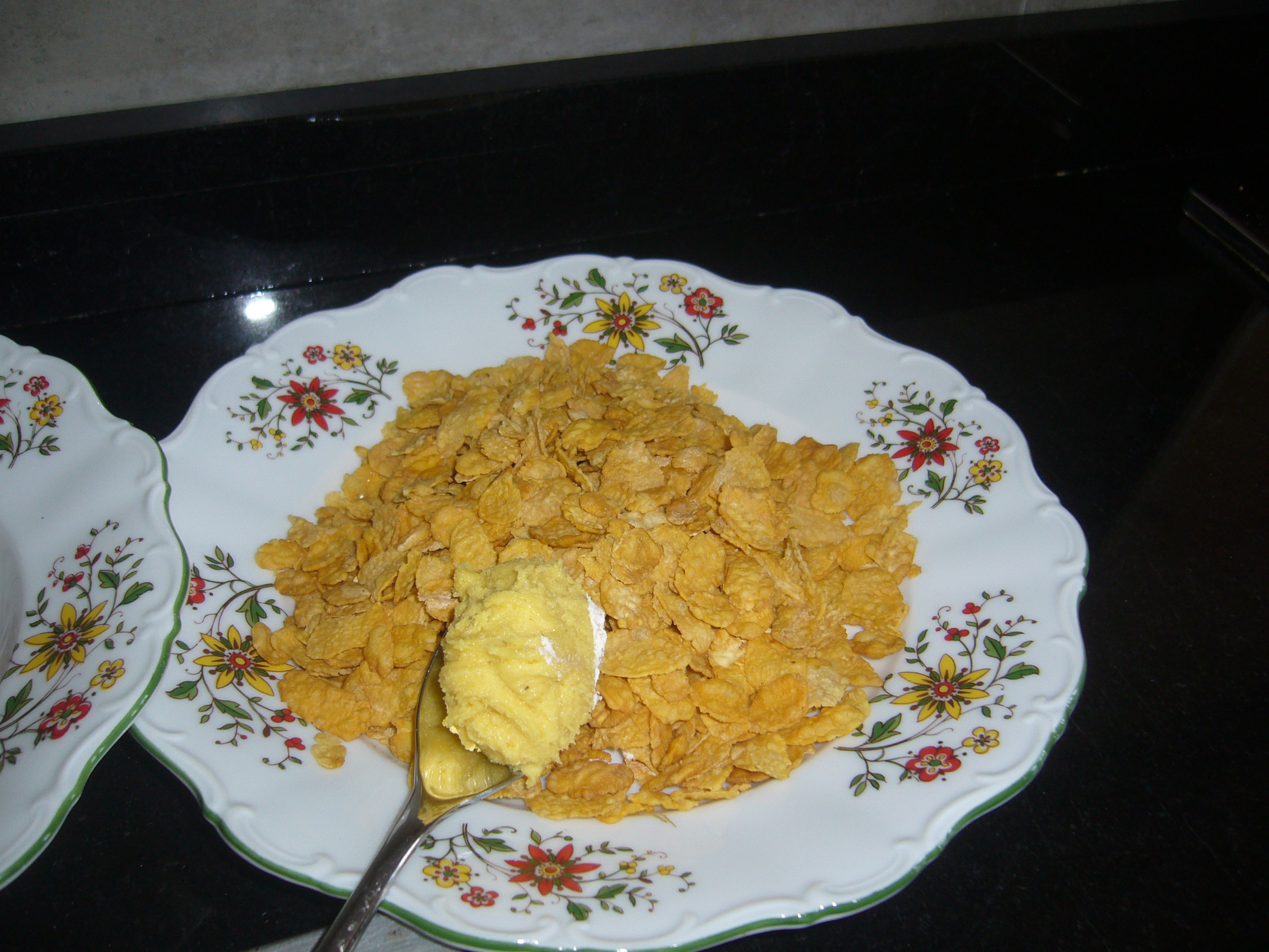 perndere il composto con un cucchiaino e metterlo nel piatto per farvi aderire i corn flakes