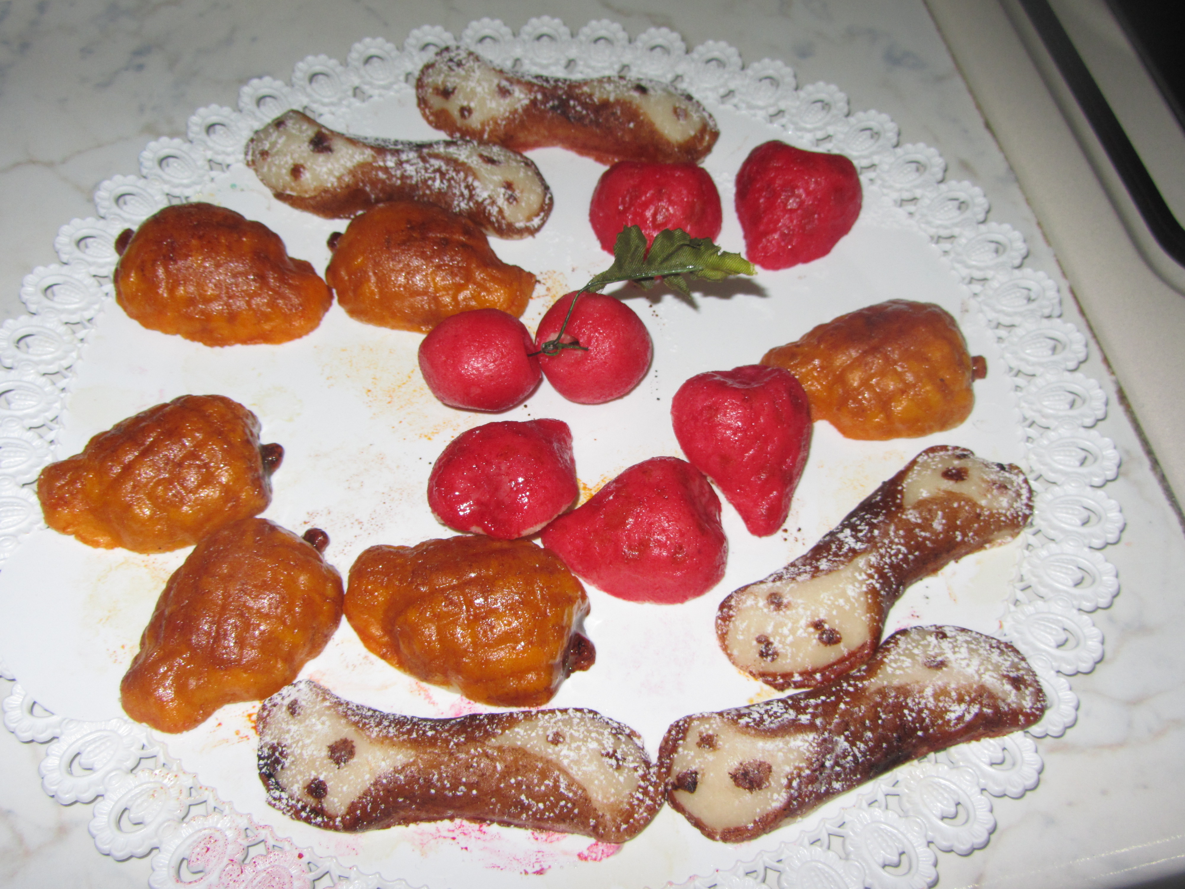 preparare lo zucchero a velo :20sec./vel.9.riunire sul fondo con la spatola.unire le mandorle:20sec./vel.9.aggiungere l'acqua bollita con la cannella,l'acqua,glucosio,estratto di mandorla e la vanillina:30sec./vel.4.formare delle palline e inserirle negli stampi di gesso .per non attaccare mettere la pellicola trasparente negli stampi.lasciare riposare un giorno e poi si puo' dipingere.