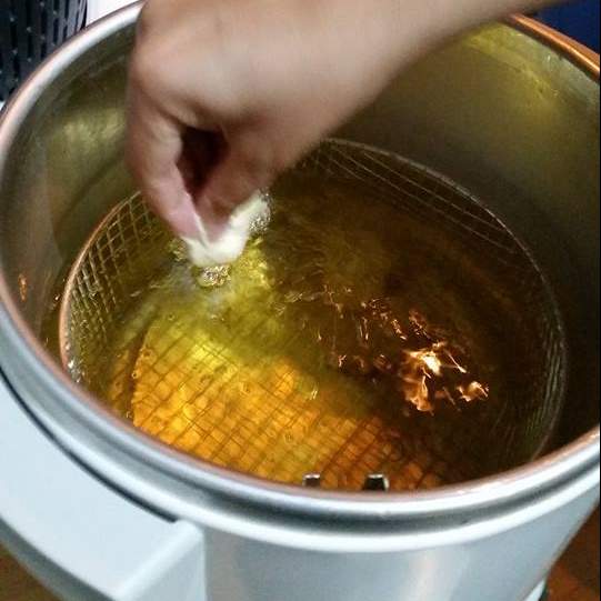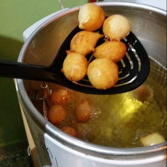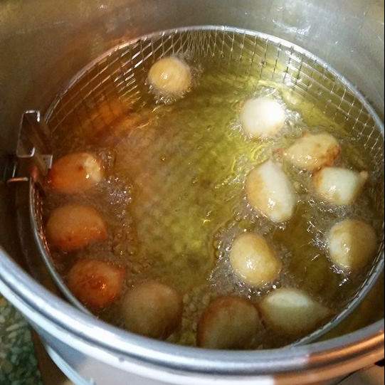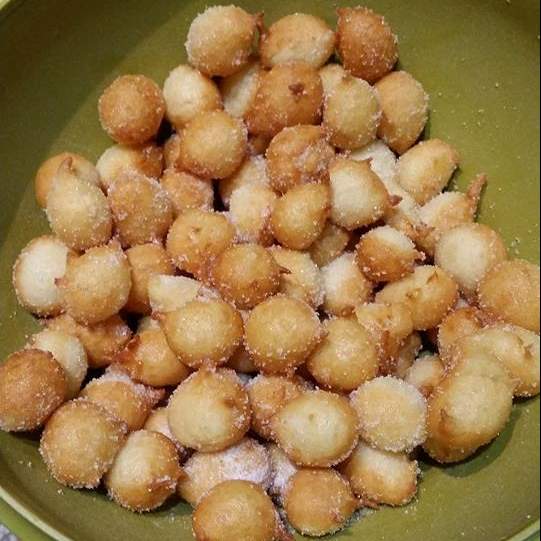 dopo che l'impasto sarà lievitato riscaldare una pentola alta l'olio e creare delle palline di impasto aiutandovi con 2 cucchiaini buttarli dentro la pentola o con le mani come in foto e far dorare entrambi i lati (piu o meno 40 secondi per lato a fiamma bassa) scolate su carta assorbente e successivamente su un piatto da portata e cospargete di zucchero