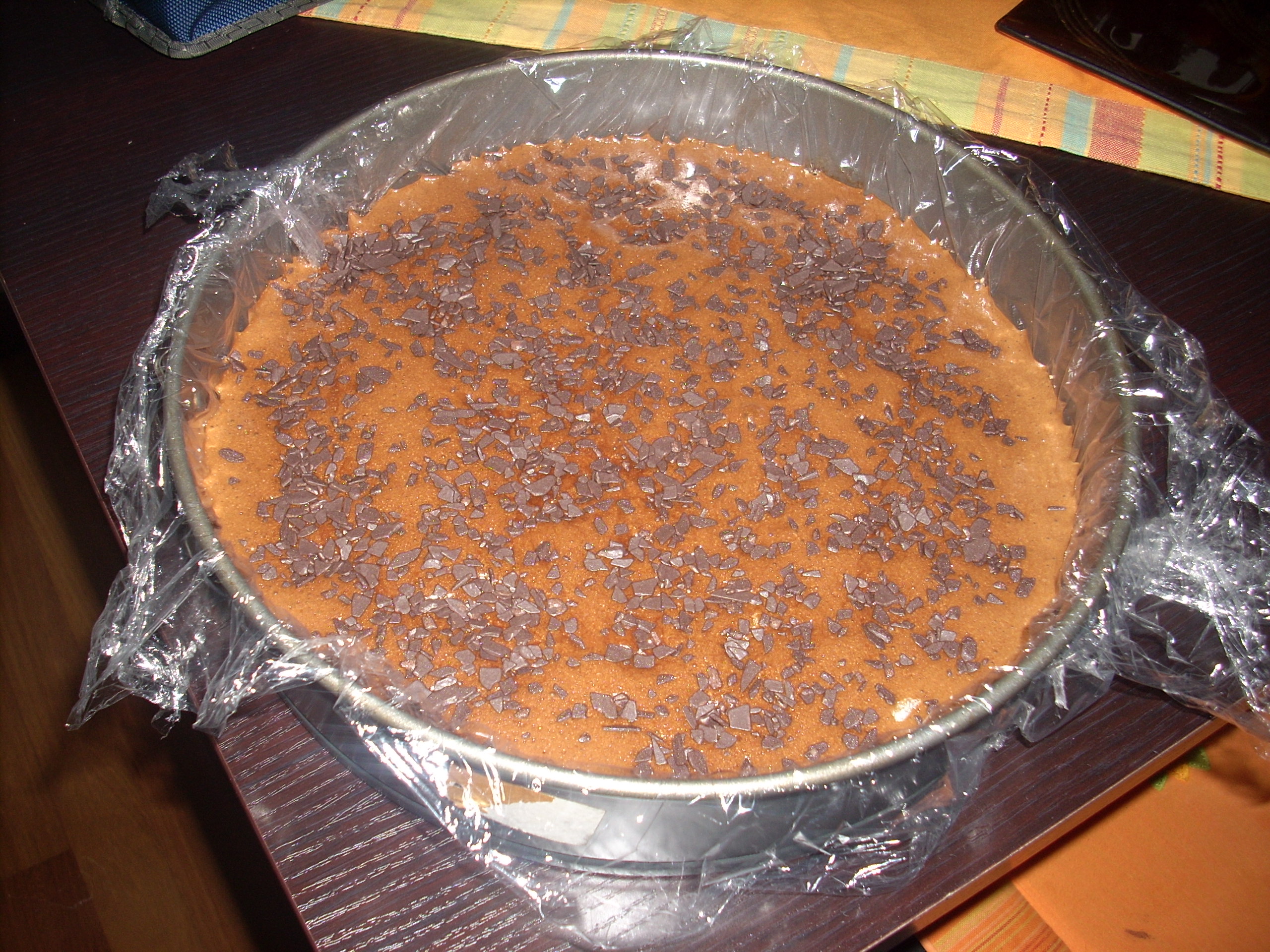 nel frattempo preparare la mousse e spalmatela sulla base dei biscotti e cospargere con le scagliette di cioccolato.