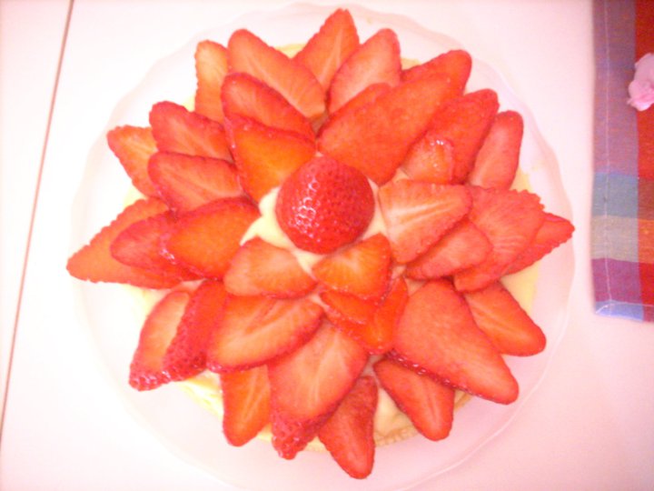 METTERE LA CREMA E DECORARE CO LE FRAGOLE PARTENDO DALL'ESTERNO E POSIZIONANDO LA FRAGOLA INTERA AL CENTRO