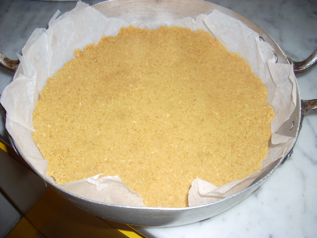 Foderare l’interno dello stampo con la pellicola .versare sulla pellicola i biscotti con il burro per formare la base della torta.pressare con un batticarne , tenere da parte in frigo