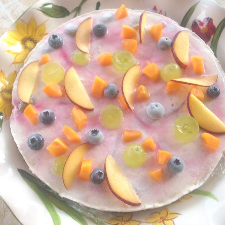 "coperchio chiuso" non lavato mettere yogurt ricotta e zucchero 25 sec vel 5 aggiungere la colla (già ammollata in acqua fredda epoi scaldata x qualche secondo nel microonde)15sec vel 5 ,versare il tutto sulla base di biscotto mettere la torta in frigor x un 'ora decorare a piacere con frutta fresca e riporre in frigor x altre 3/4 ore o fino al momento di servirla