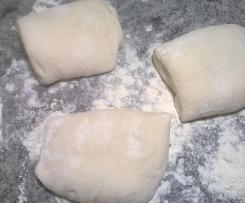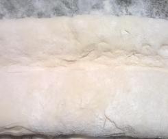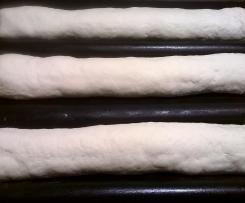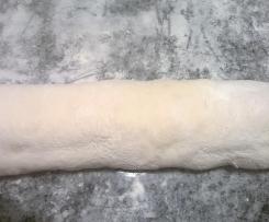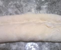 - Rifare l'operazione di prima su ogni pezzo,allarghiamo leggermente con le dita e piegare l'impasto dall'alto verso l'interno a meta',la parte bassa verso l'interno,poi ripieghiamo dall'alto verso il basso schiacciando l'impasto con la palmo della mano,giratelo e viene come una cucitura,dopo di che' arrotoliamo fino ad ottenere un filoncino lungo piu' o meno lungo quanto la placca del forno,ripetere l'operazione con altri pezzi,metterli nello stampo con carta da fono o se avete lo stampo in sillicone da baguette,la parte della cucitura metterlo sotto,mettete della farina sopra e fate lievitare per un'altra ora sempre coperto.