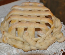 Dopo aver steso le strisce in un senso, spennellarle con un po di uovo sbattuto in modo da poter fare aderire le strisce che si andranno a sovrapporre, iniziare a stendere le strisce dall'altro lato in modo da creare la trama della cesta