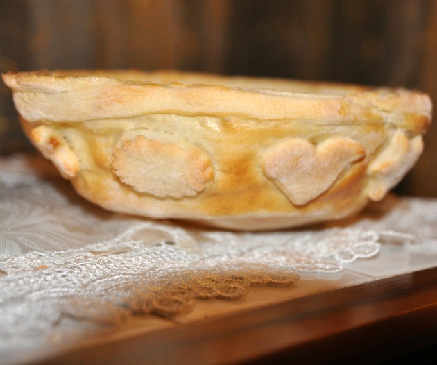 Con la rotella tagliare delle strisce larghe un paio di cm, spennellare la forma in alluminio con l'uovo sbattuto e iniziare ad adagiarle sullo stampo capovolto pressando leggermente con le mani