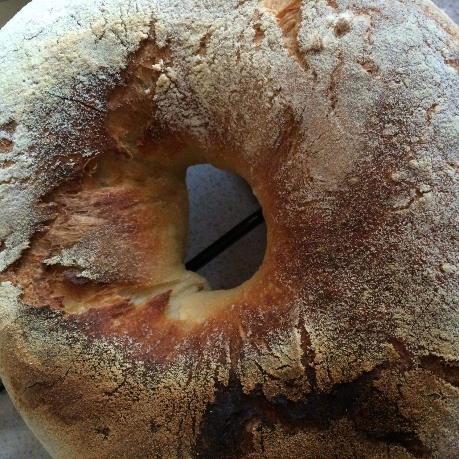 sciogliere il lievito madre rinfrescato nell'acqua per 10 sec vel 3. Aggiungere 400g semola rimacinata e lavorare per 30 sec vel 3. Aggiungere il sale e lavorare per altrettanti 30 sec vel 3. mettere l'impasto a riposare in una ciotola per un'oretta, poi fate tre giri di pieghe (su YouTube potete vederle) e date forma al pane. Praticate con il pollice un buco centrale aprendo la ciAmbella. Mettete a lievitare in teglia coperto per 3-4 ore (dipende dalla forza del lievito e dalla temp esterna) e infornare a 230 per 15 min e 180 per 40 min