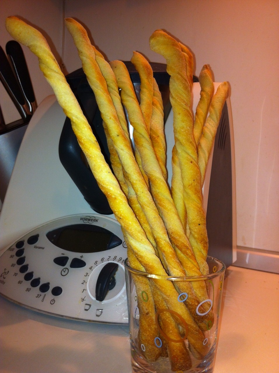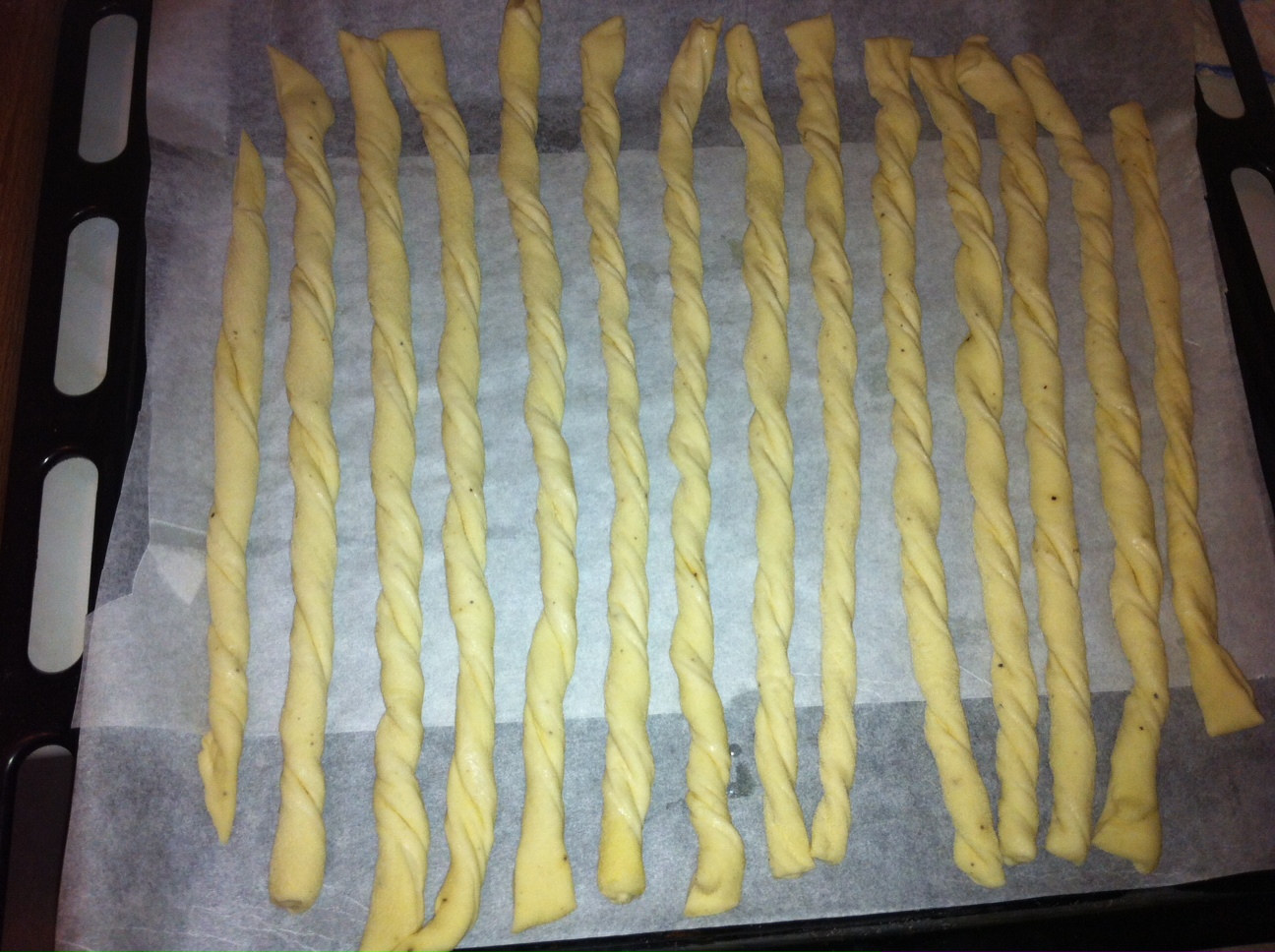 Passato il tempo, con l’aiuto di una rotella per pizza tagliate i grissini, circa 1 cm di larghezza, una volta tagliati tutti, prima di posizionarli sulla teglia attorcigliteli e prima di infornare lasciate riposare nuovamente i grissini messi nella teglia per 15/30 min., poi cuocere il forno 180° per 20 min., ma questo dipende sempre dal vostro forno.