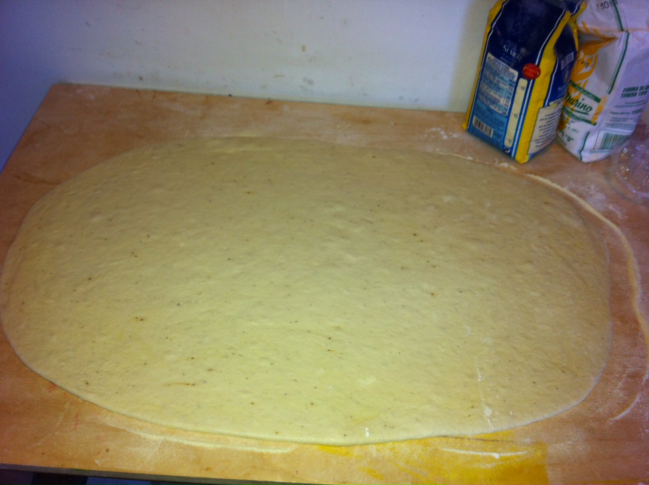 Prima di riprendere l’impasto lievitato, cospargere la spianatoia di farina di semola di grano duro, metteteci sopra la pasta e spianatela come per la pizza, in un rettangolo dalle dimensioni della vs. teglia da forno, potete aiutarvi con il matterello, spessore circa ½ centimetro, poi coprite con un telo e lasciate riprendere un po’ la lievitazione per 30 min. circa.