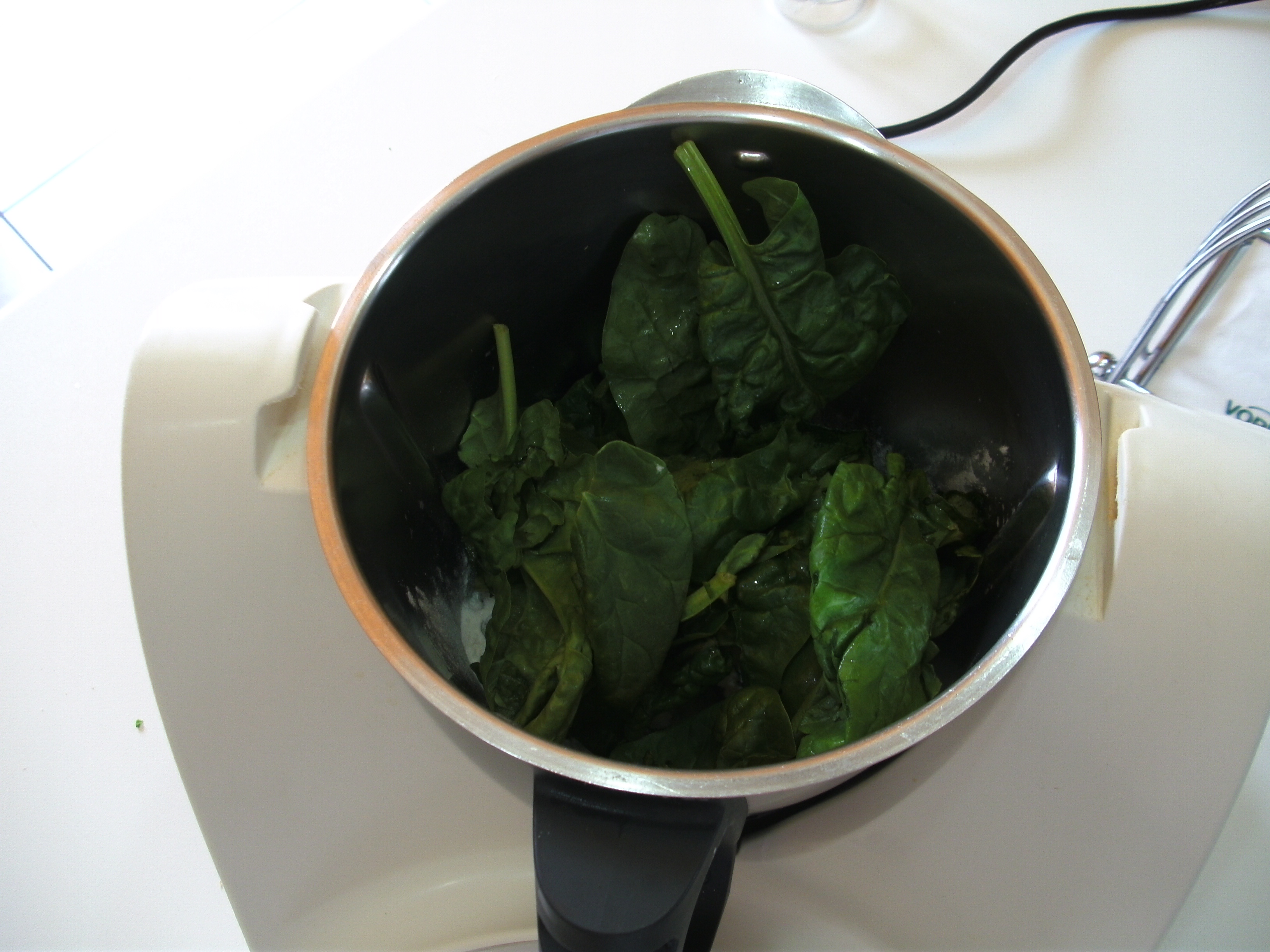 "coperchio chiuso" mettere la farina con gli spinaci e polverizzare per 40 sec. vel 8. Aggiungere 1/3 del cubetto di lievito, 90 gr di acqua, sale, olio. Impastare per 1 min vel