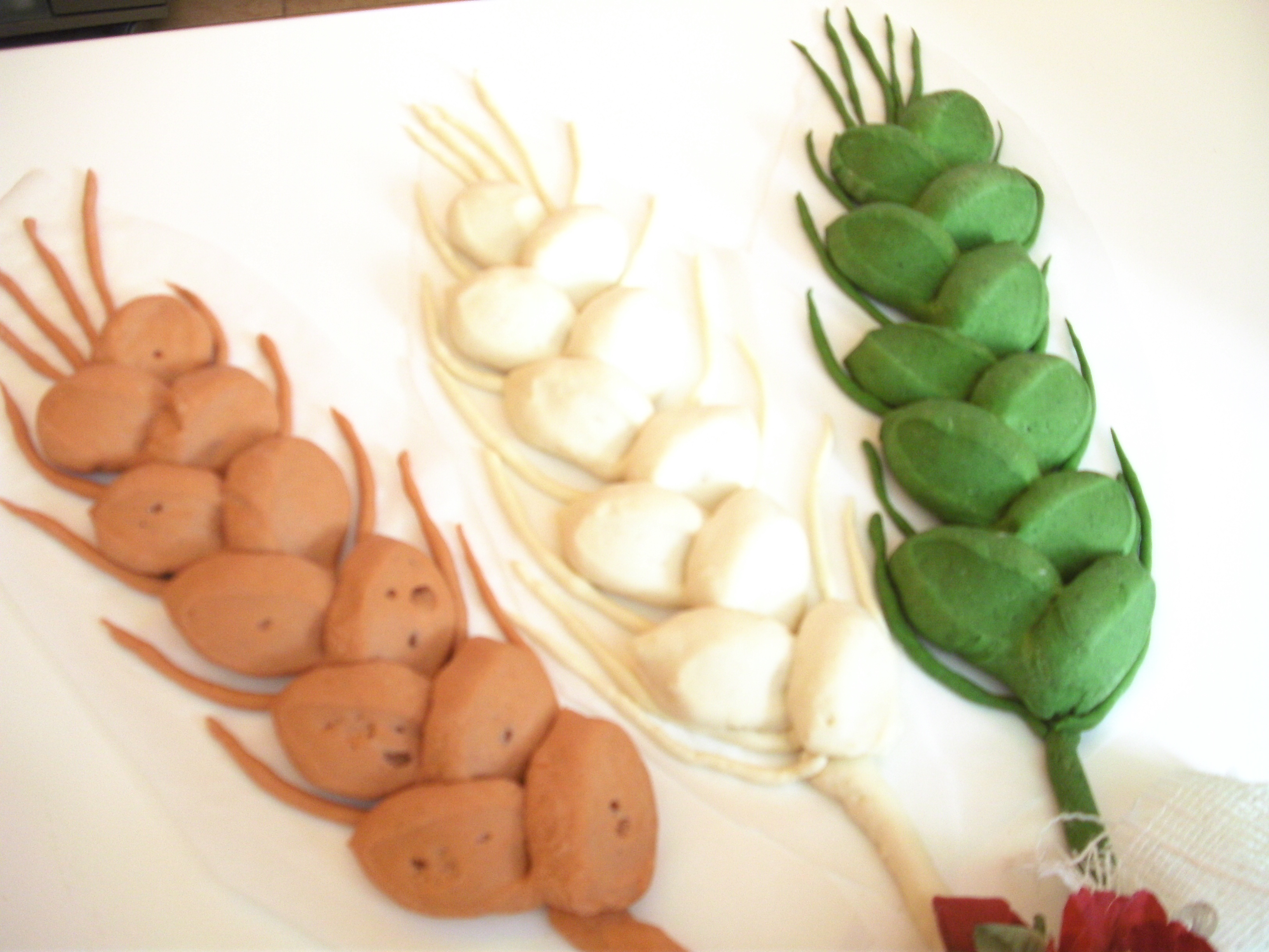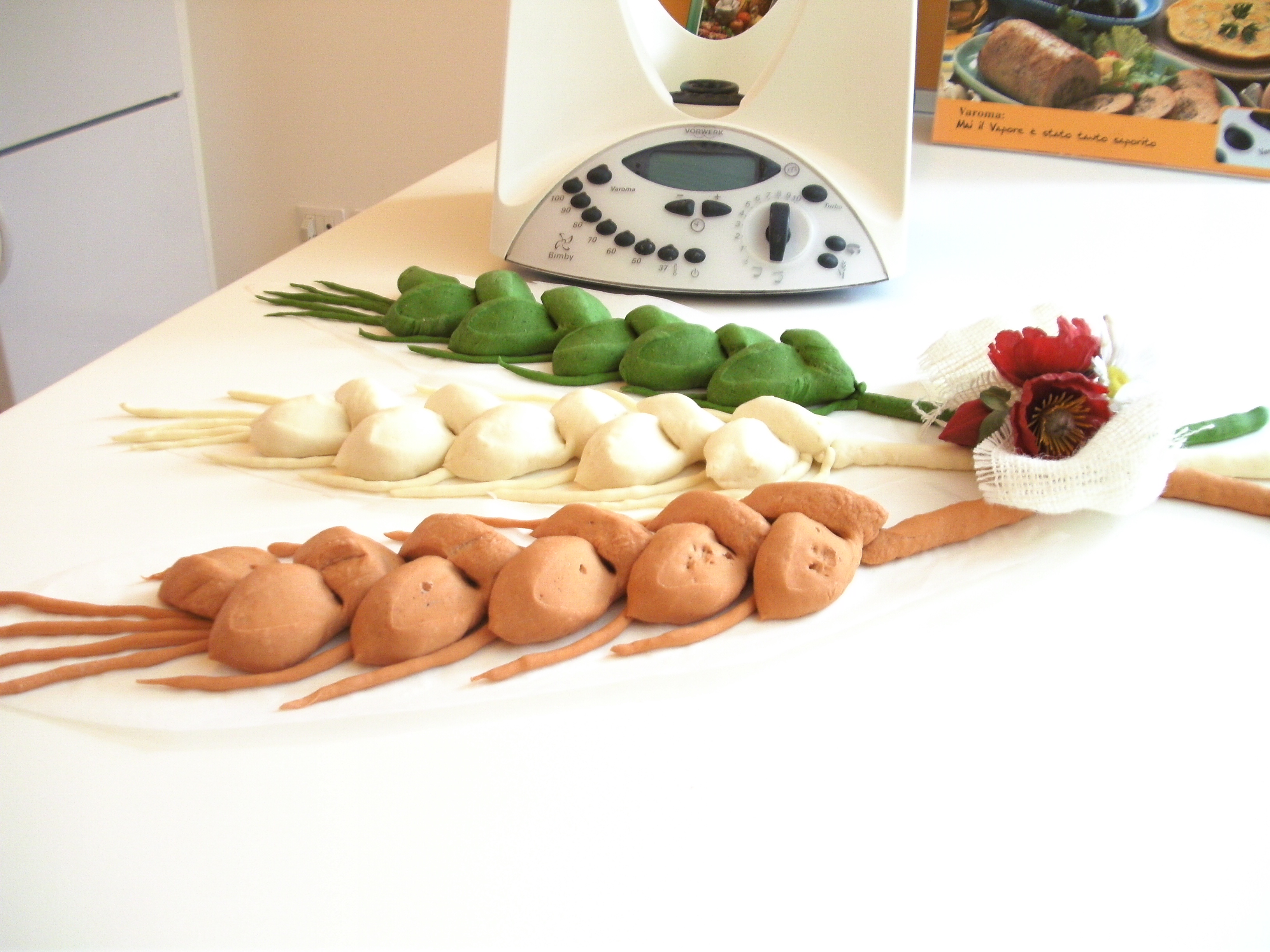 "velocità spiga" .Lasciar lievitare gli impasti fino a far raddoppiare il loro volume, poi dare la forma della spiga come da foto. Cuocere in forno per 20 min a 180°C.