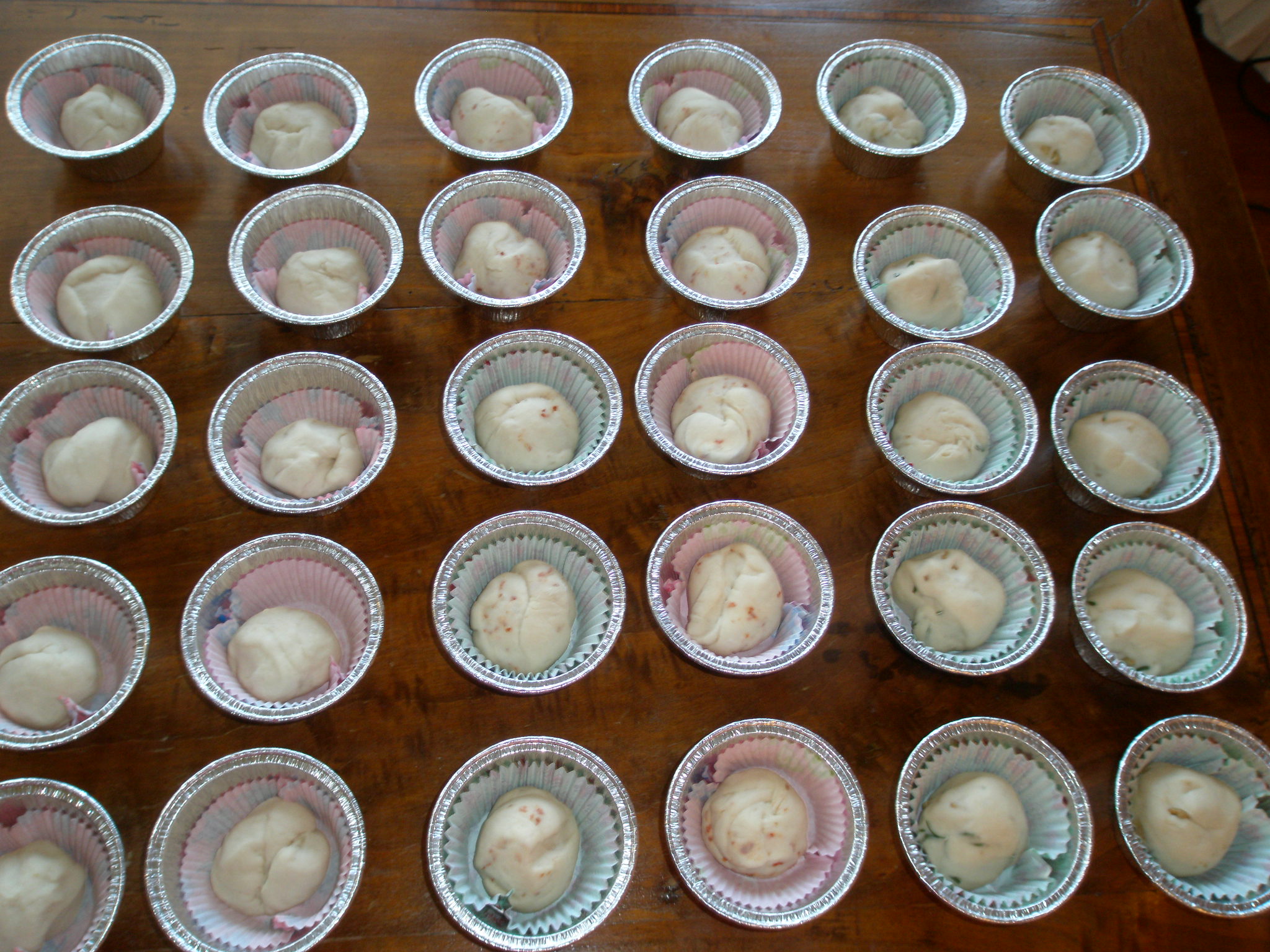 Dopo averle perfettamente amalgamate, ricavare da ogni terzo di impasto 10 palline e disporle nel pirottino di carta inserito in quello di alluminio.