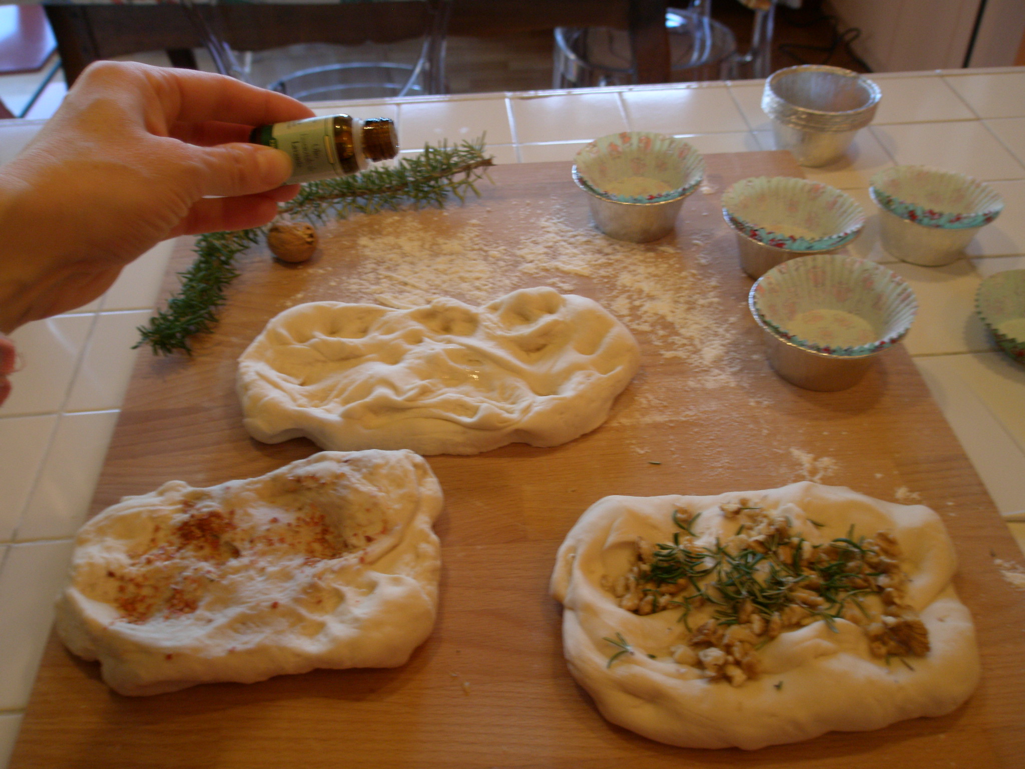 Nella prima aggiungere abbondante peperoncino, nella seconda mettere rosmarino fresco e noci schiacciate e nel terzo impasto aggiungere SOLO 2, max 3, gocce di lavandula officinale.
