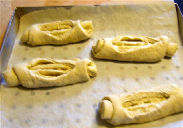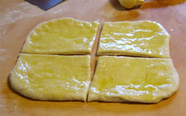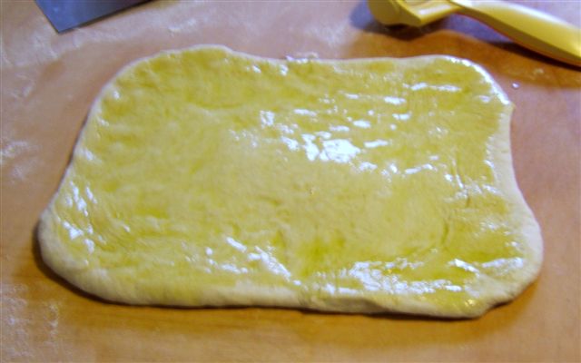 Spianarli a circa 1/2 cm di spessore formando un rettangolo di circa 20x30, su un foglio di carta forno e con un pennello ungerli d'olio e arrotolarli non stretti (altrimenti l'olio fuoriesce) partendo dal lato più corto.