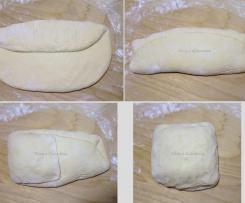 Lasciare riposare 30/40 minuti a temperatura ambiente, successivamente riporre la ciotola in frigo per 8 ore. - Trescorse le 8 ore, infarinare abbondantemente il piano di lavoro, trasferisci l'impasto e infarinarlo. Procedere allungando l'impasto per formare un rettagolo e fare le quattro pieghe.
