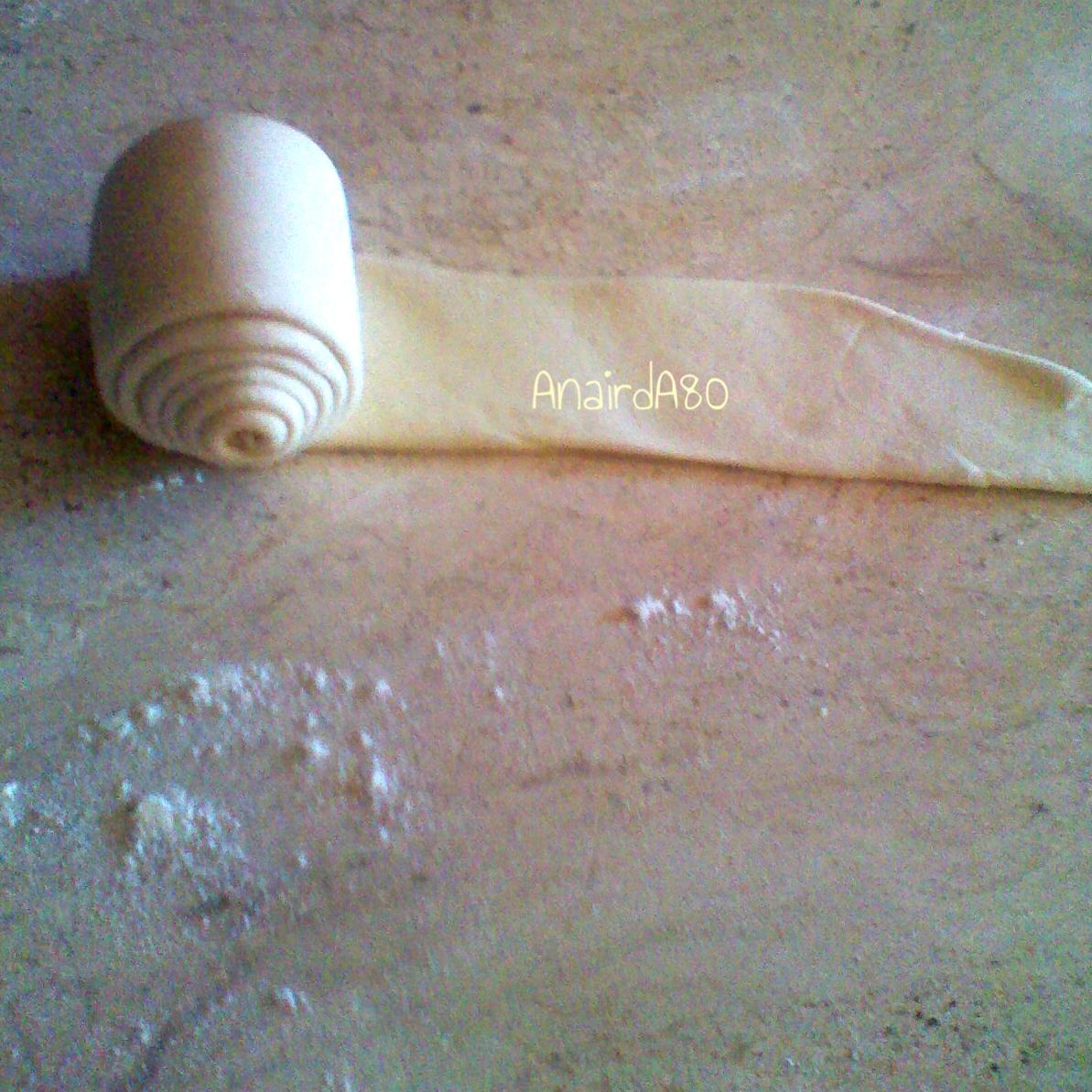 con l'aiuto del matterello stenderlo bene e arrotolarlo (come da foto anche se ora vi uscirà una striscia larga) prendere il cilindro ottunuto e con il matterello stenderlo(striscia stretta come foto) prima da un lato poi, rinfarinando la base se serve, girare la striscia e continuare a stendere .