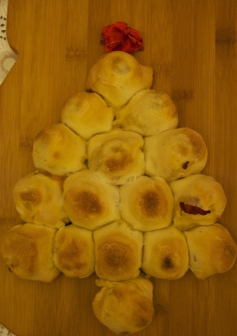 Stendete subito l'impasto in una sfoglia sottile rettangolare. Ritagliate 16 quadrati. Spennellateli di olio d'oliva, spargete un po' di sale fino e origano. mettete un pomodorino su ogni quadrato di pasta e chiudete formando delle palline. Disegnate con le palline la forma di un albero e lasciate lievitare al riparo da correnti per un'ora. Cuocete 15 minuti a 200°, poi altri 10 a 180°.