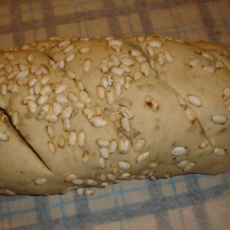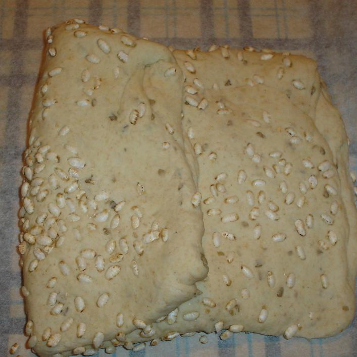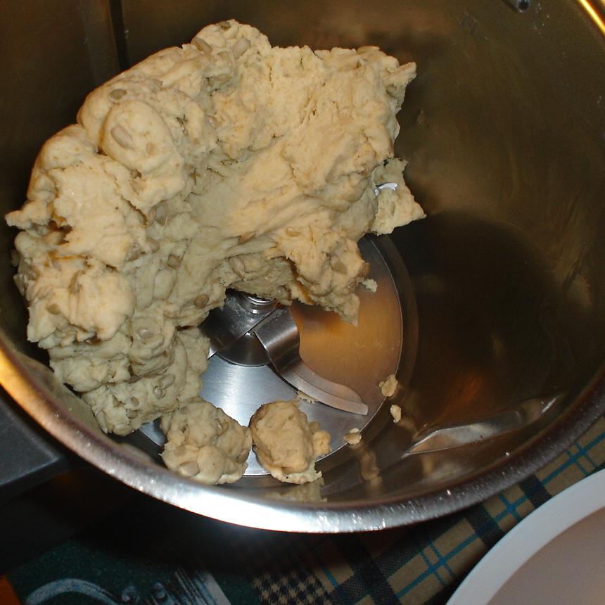 Aggiungere all'impasto i semi di girasole (ma non il riso soffiato): 1 min. vel. spiga.Si otterrò un impasto elastico e abbastanza consistente (i boccale risulterà pulito). Formare una palla con l'impasto, porlo a lievitare in una ciotola, coperto, dopo aver praticato un taglio a croce profondo., fino al raddoppio del volume. (circa 2 ore)