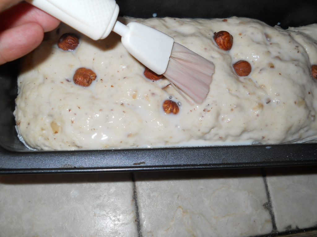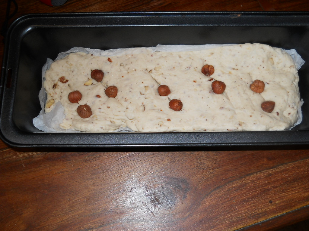 Una volta pronto l'impasto stendere dentro uno stampo da plume cake e fare dei tagli con un coltello per inserire qualche nocciole coprire con pellicola e fate lievitare per 2 ore