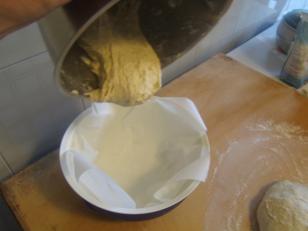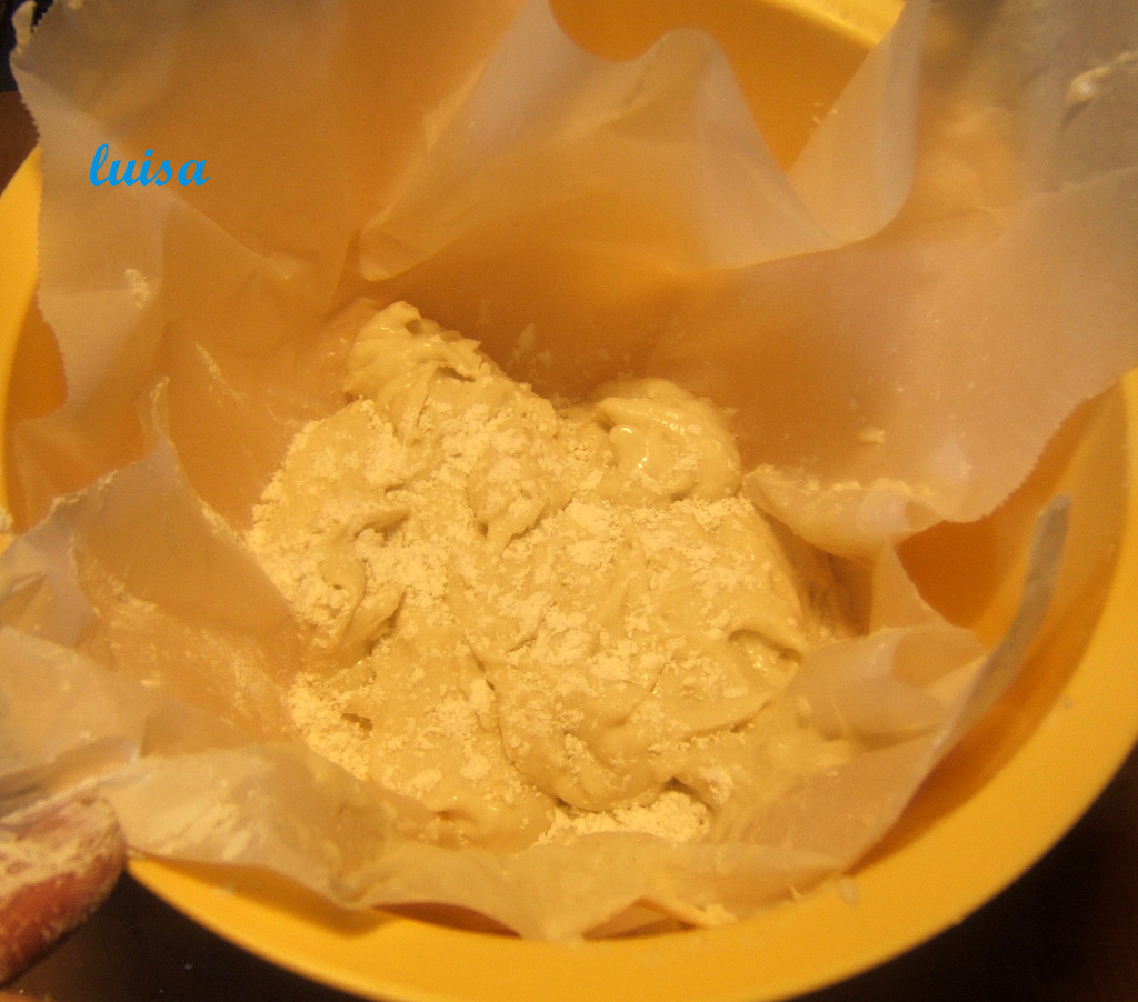 Coprire una ciotola con la carta forno, versare l'impasto spolverizzarlo con la farina, coprire e lasciare lievitare per non meno di 1 ora e mezzo.