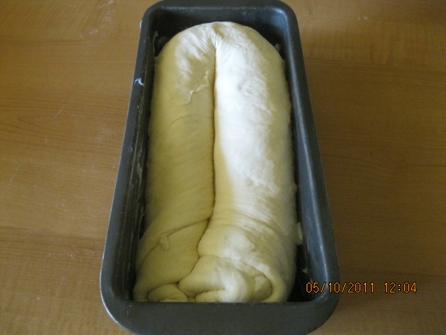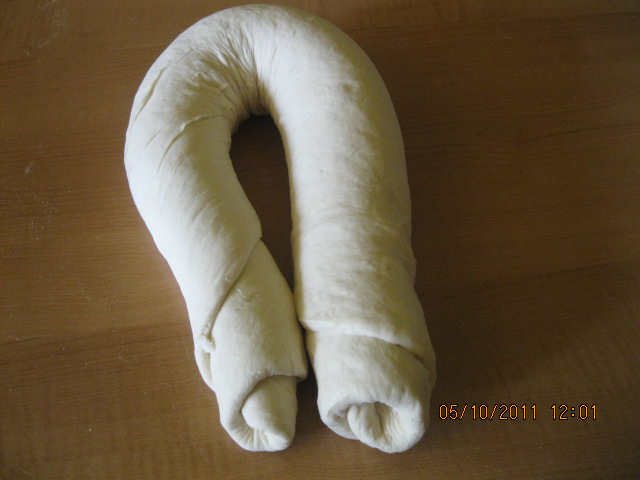 "velocità spiga" . Lasciare riposare in una ciotola coperta fino al raddoppio. Riprendere la pasta lievitata, stendere in una sfoglia sottile e spalmarla con lo strutto. Arrotolarla e dare la forma a ferro di cavallo , adagiarla nello stampo da plum cake unto , con il coltello fare un taglio profondo lungo tutta la superfice del salsicciotto, e lasciarlo lievitare fino al raddoppio. Prima di infornarla a forno caldo a 180° per 40/45m spennellare la superfice con lo strutto. Se dovesse colorire troppo coprirla con carta da forno.Per la cottura adeguarsi al propio forno