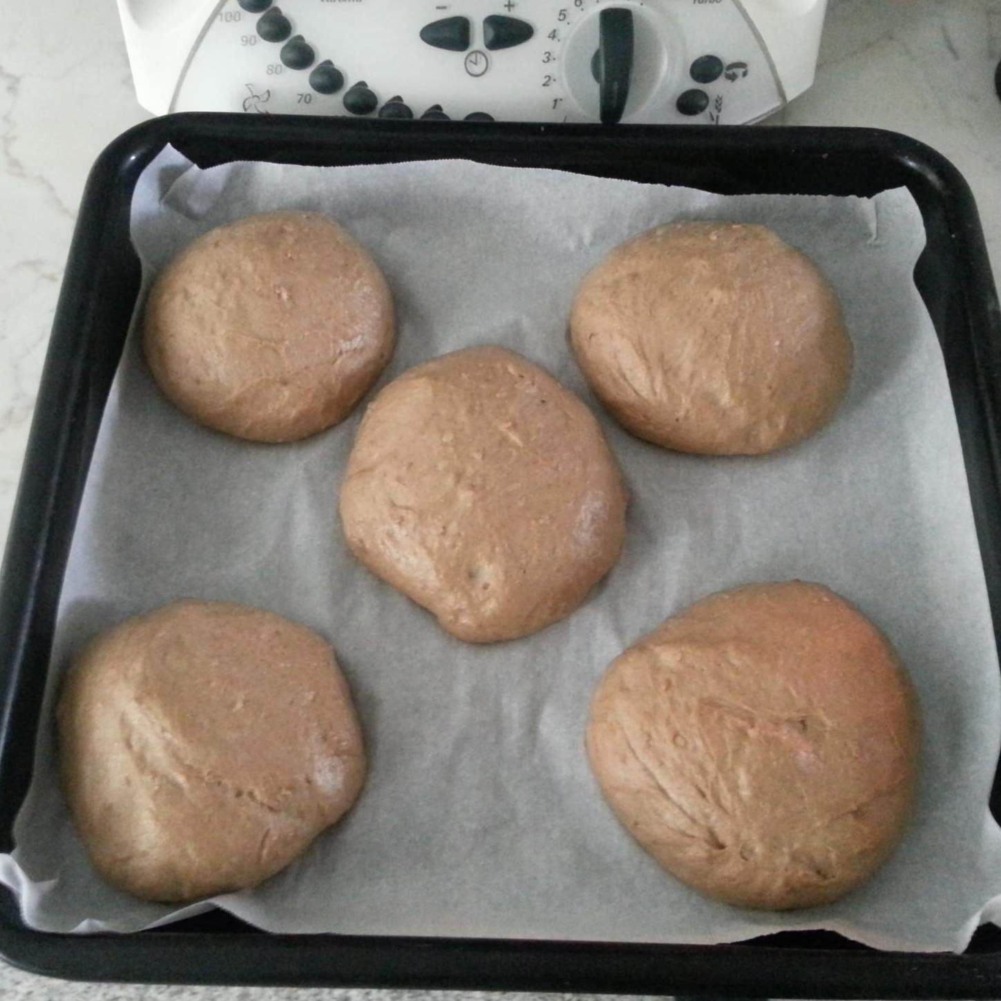 Dopo la lievitazione, formare 5 palline (o 6 se preferite panini più piccoli) e sistemarli nella teglia con carta forno, distanziati tra loro.