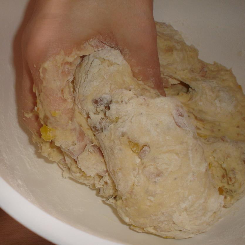 4. Si otterrà un impasto molto morbido e appiccicoso. Sistemarlo con un po' di farina per poter formare una palla, praticare un taglio a croce e porre a lievitare in luogo riparato e coperto per due ore (o fino a raddoppio)
