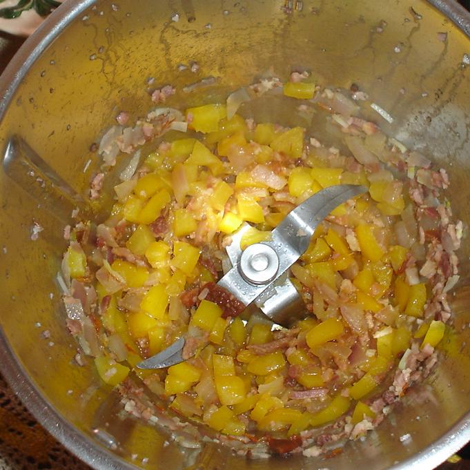 1. Nel boccale inserire la pancetta (io speck) e dare tre-quattro colpi di turbo. Inserire 5 gr olio e.v.o, il peperone e la cipolla tagliati a dadini e una spolverata di pepe: 7 minuti 100° antiorario vel. 1